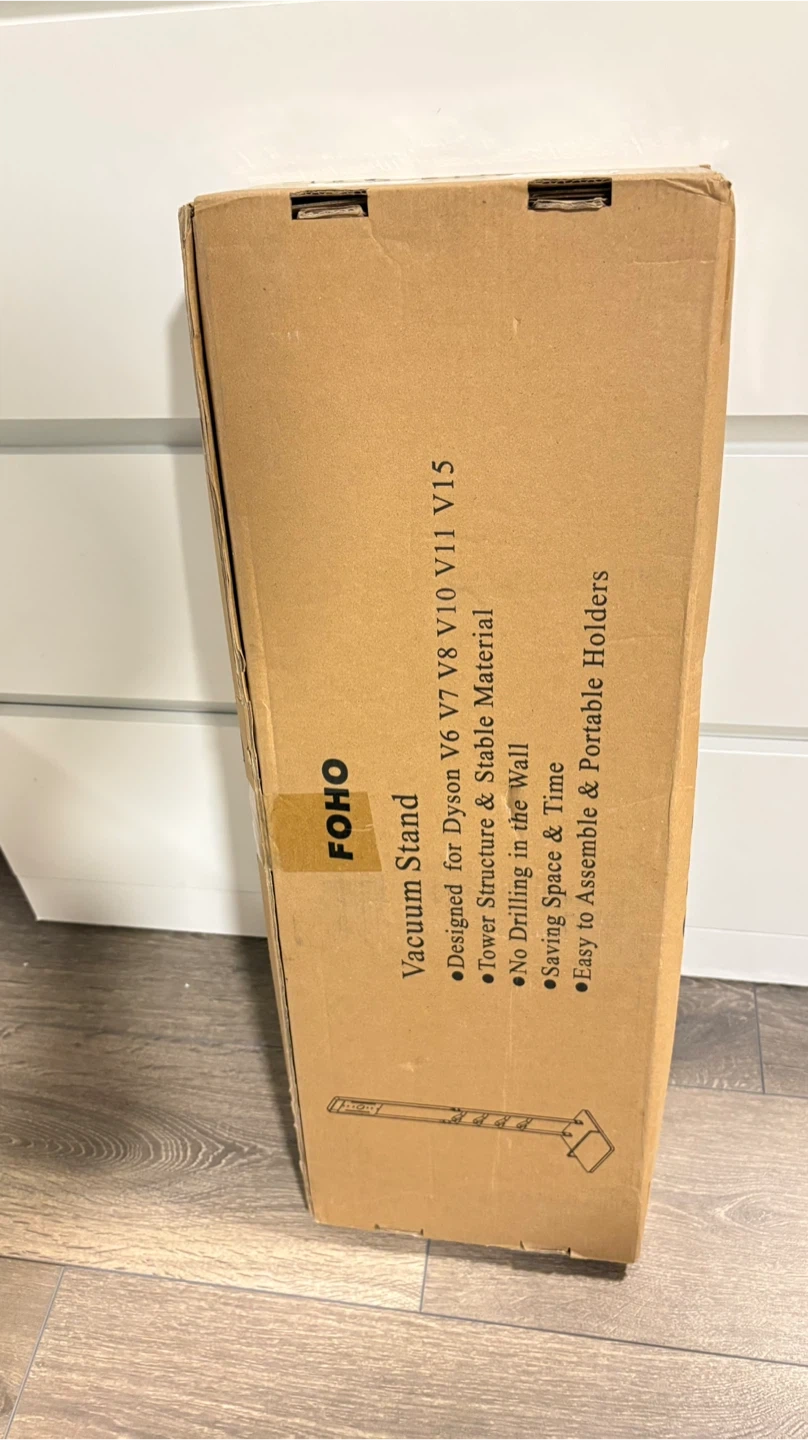 This is a FOFO vacuum stand. It's designed for Dyson V6, V7, V8, V10, and V11 vacuums. The stand features a tower structure and stable material, and it's easy to assemble. No drilling in the wall is required, saving space and time.