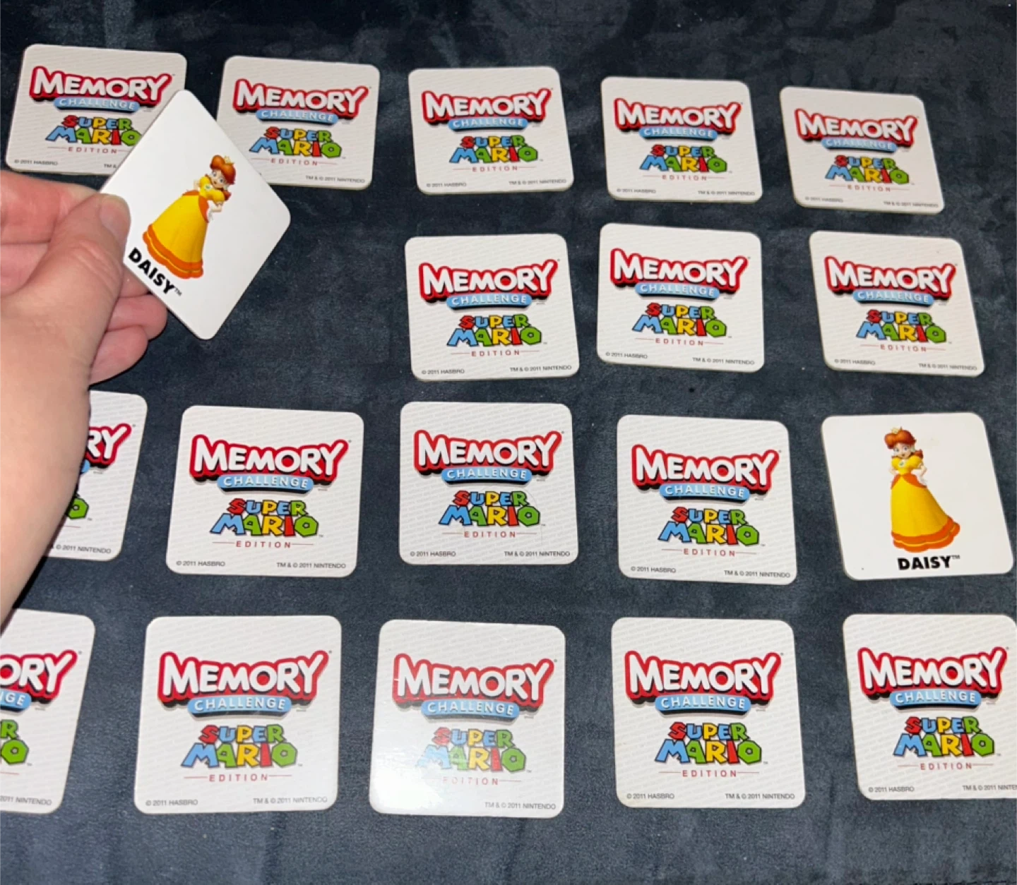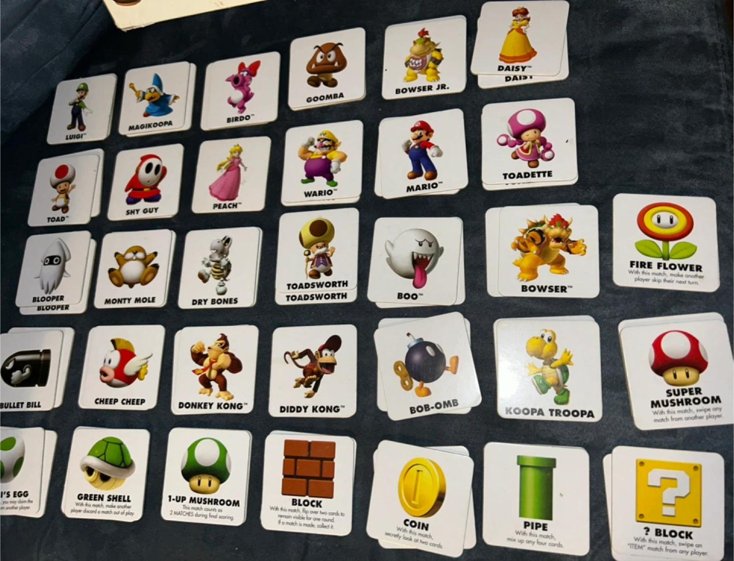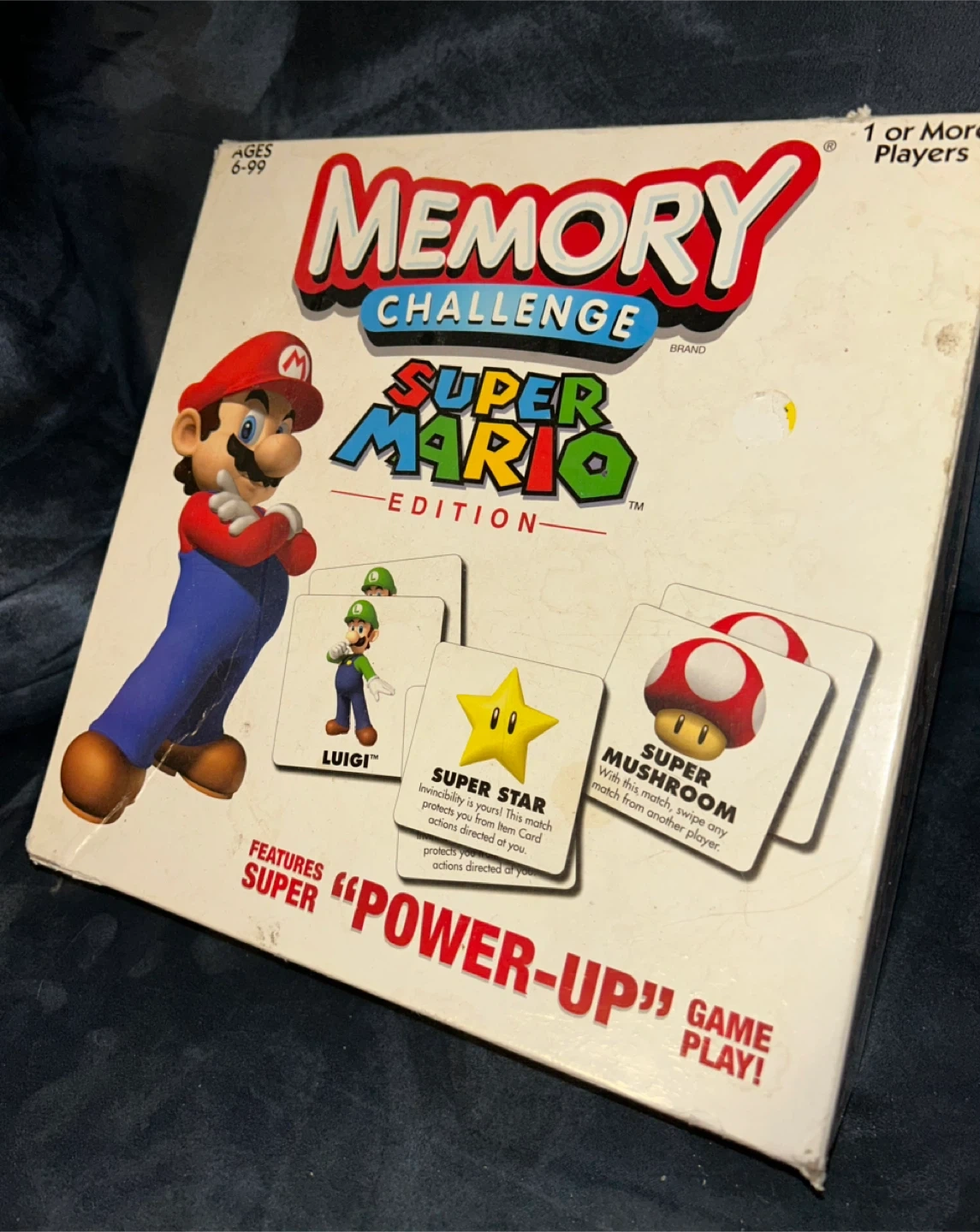 This is the Super Mario Edition of the Memory Challenge game. It's for 1 or more players, ages 4-99. The game includes 33 pairs of cards of all the best characters and items. 8 pairs give special power-ups! It's a fun memory game for Super Mario fans!