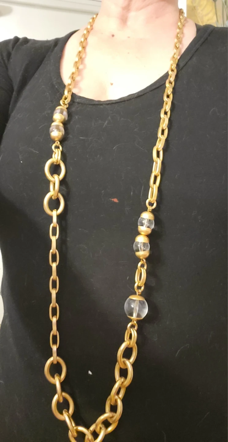 This long necklace features a gold-tone chain with alternating links and clear, round beaded sections. The clasp has a small tag with the "Yosca" logo. It's a statement piece that adds a touch of elegance to any outfit.