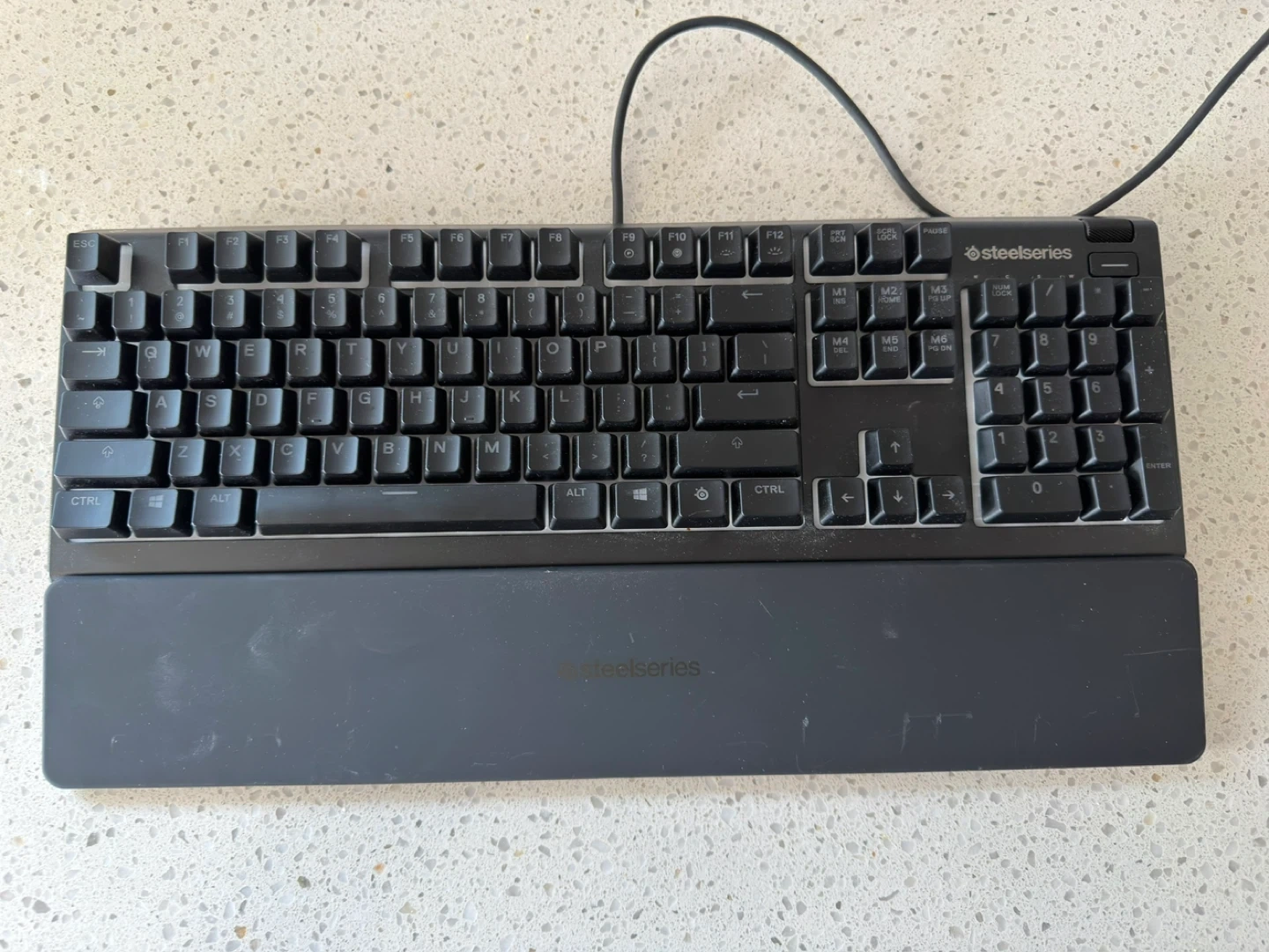 SteelSeries Apex 3 gaming keyboard with a detachable magnetic wrist rest. It's a whisper quiet keyboard with anti-ghosting capabilities and RGB illumination. Perfect for gaming sessions!