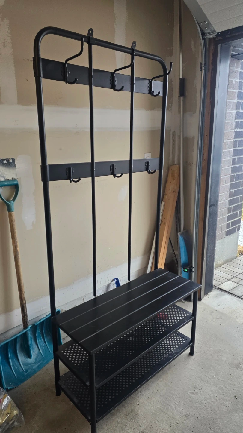 This black hall tree is a handy addition to your entryway. It features multiple hooks for coats and bags, a bench seat, and two shelves for shoe storage. Its metal construction offers durability.