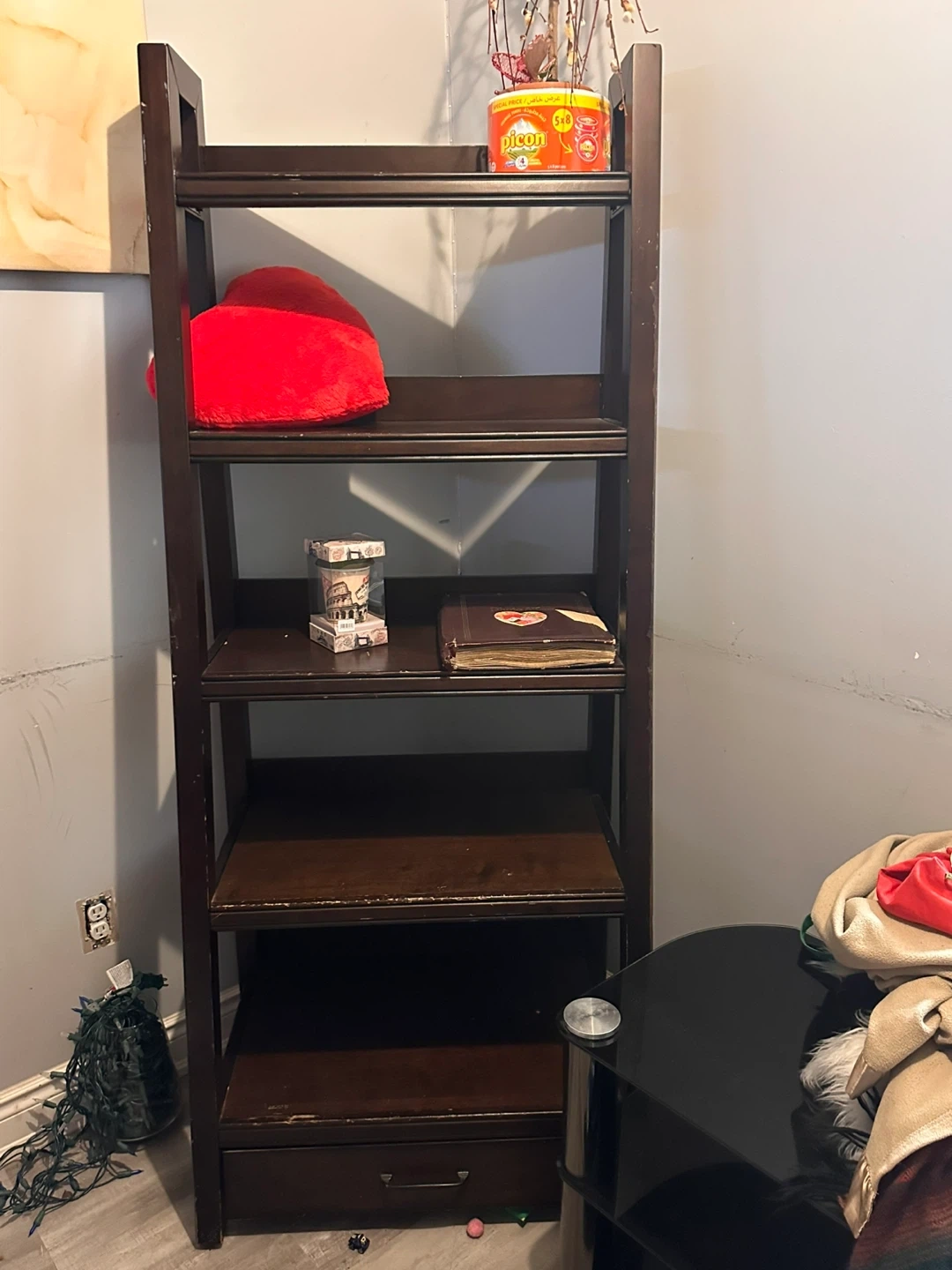 This dark brown ladder bookcase has five shelves and a drawer at the bottom. It's made of wood and provides ample storage space. This would be useful for organizing books or displaying decor.