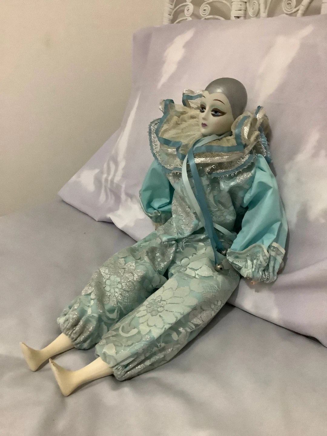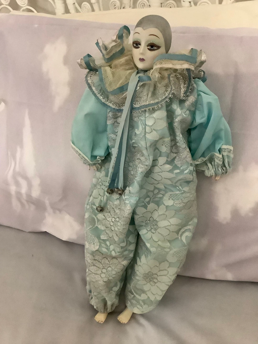 This is a charming porcelain jester doll. It's dressed in a light blue and silver satin costume with a ruffled collar. The doll has delicate painted features and a sweet expression.