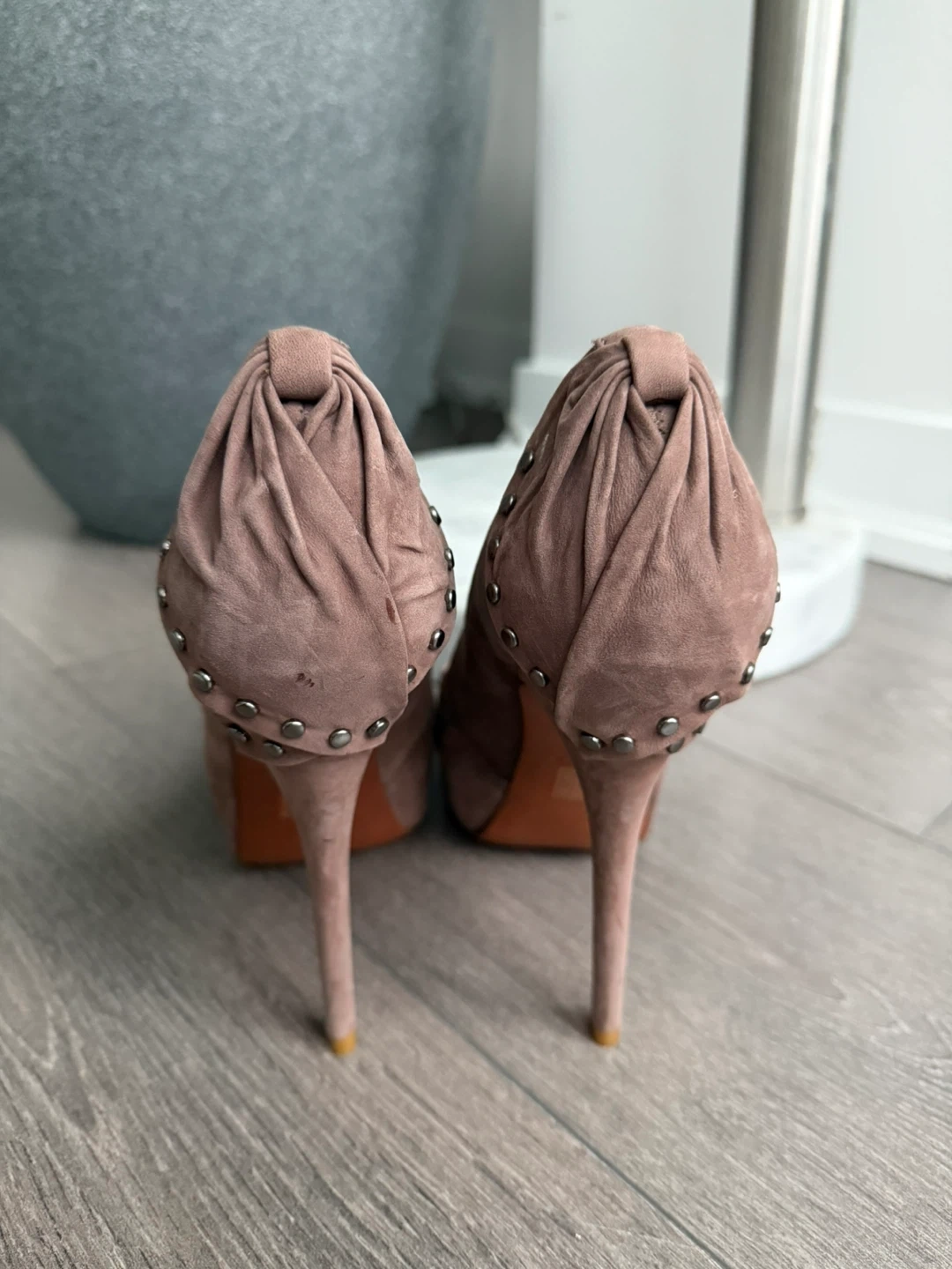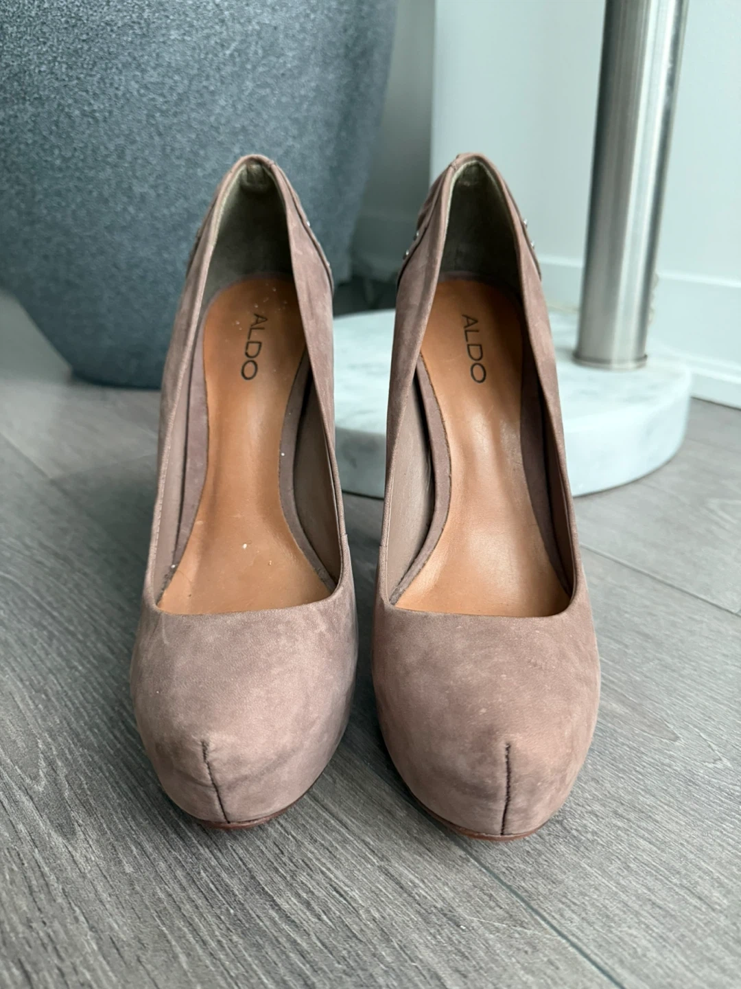 These ALDO heels are made from a dusty rose suede material. They feature decorative studs around the heel and a gathered detail at the back. These shoes are perfect for dressing up any outfit!