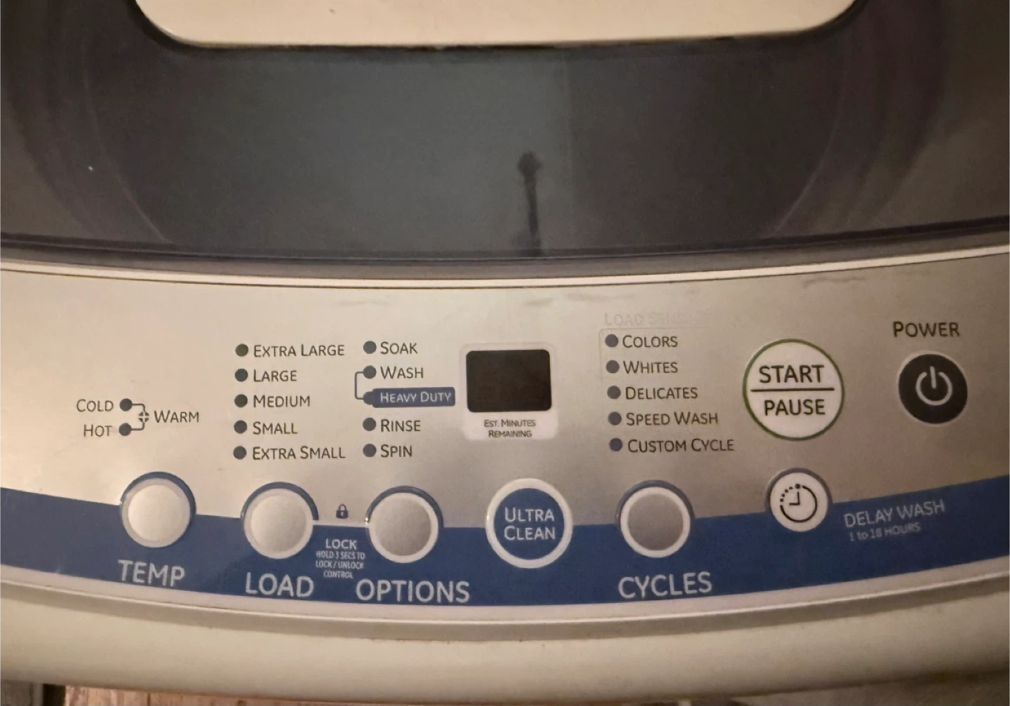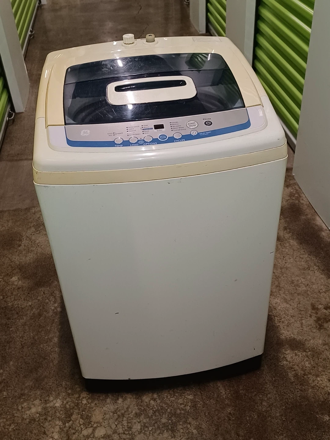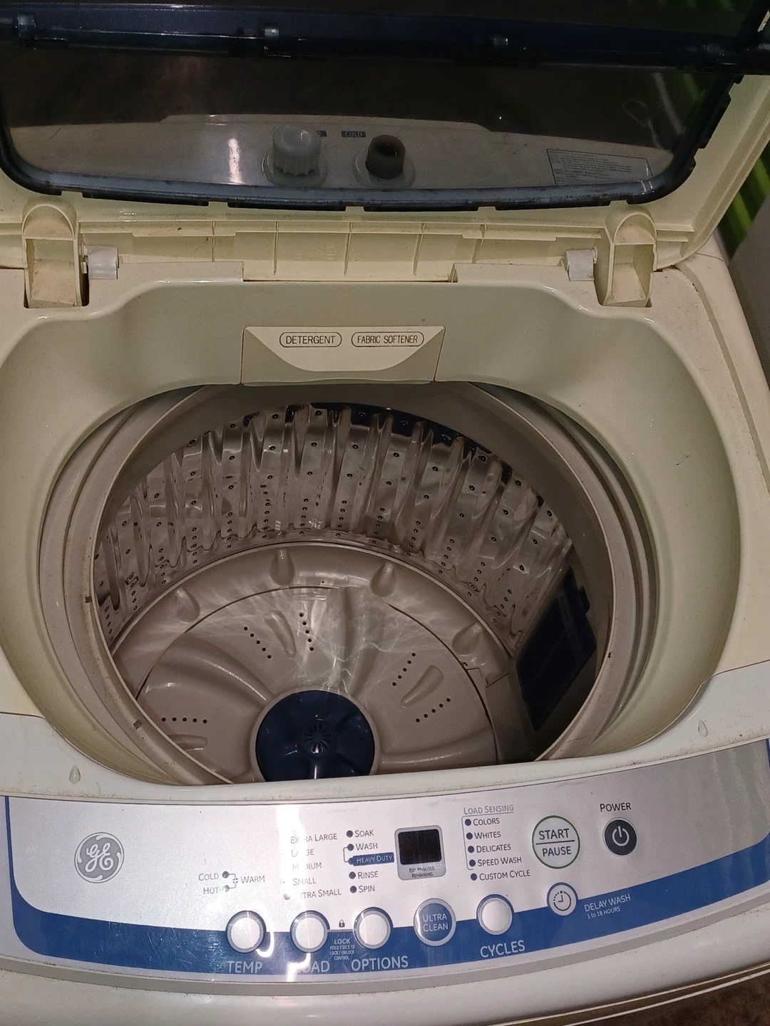 This is a GE top load washing machine. It has multiple wash cycles including Heavy Duty, Colors, Whites, Delicates, Speed Wash, and Custom Cycle. It also features load sensing and temperature selection for cold, warm, or hot water.