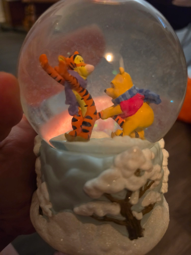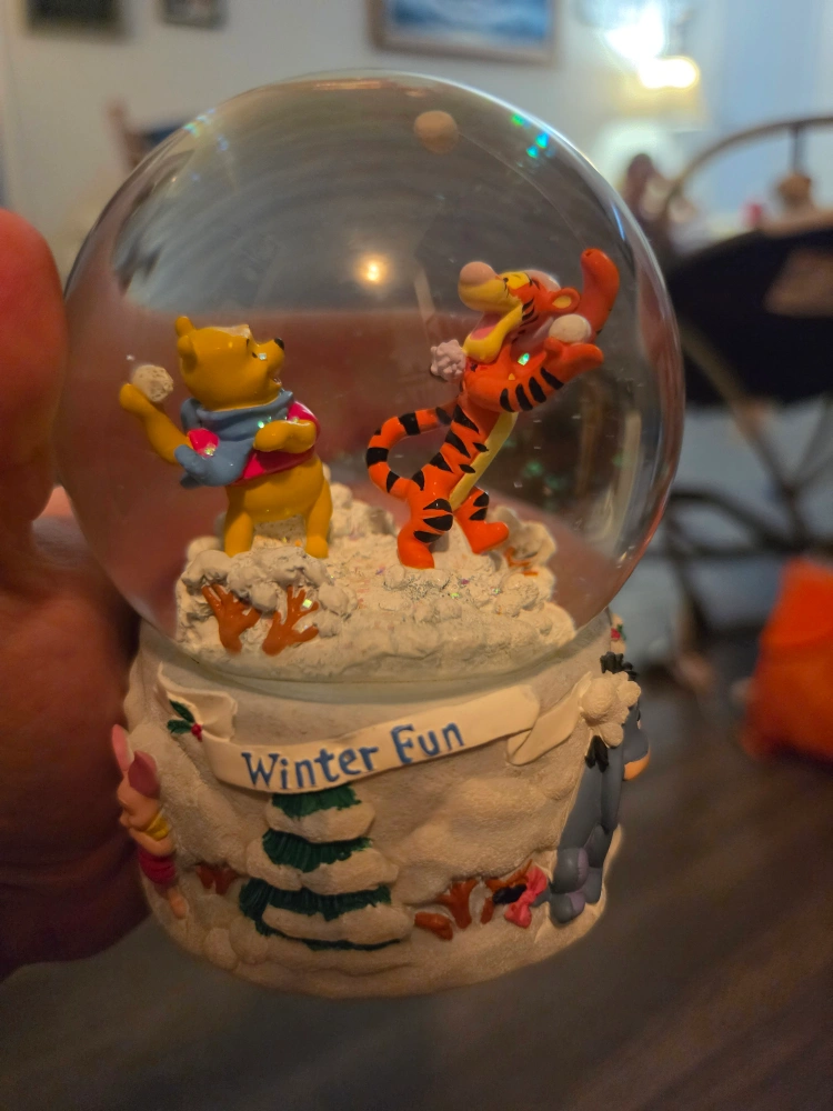 This charming snow globe features Winnie the Pooh and Tigger enjoying "Winter Fun." Eeyore and Piglet are also depicted on the base. A delightful collectible for Disney fans!