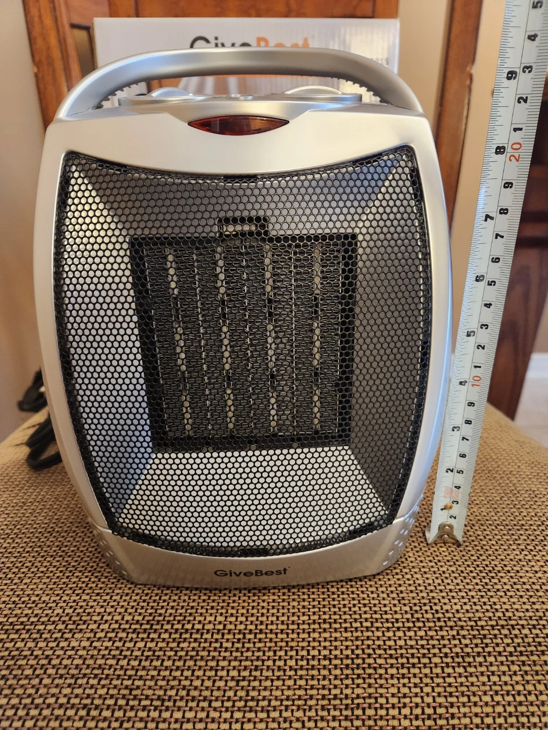 This GiveBest portable electric space heater is silver and features a compact design. It's perfect for personal use in small spaces. This unit comes with a carry handle for easy portability.