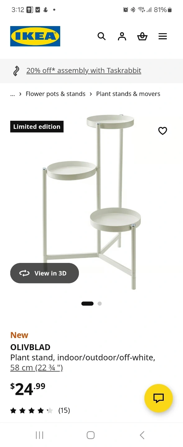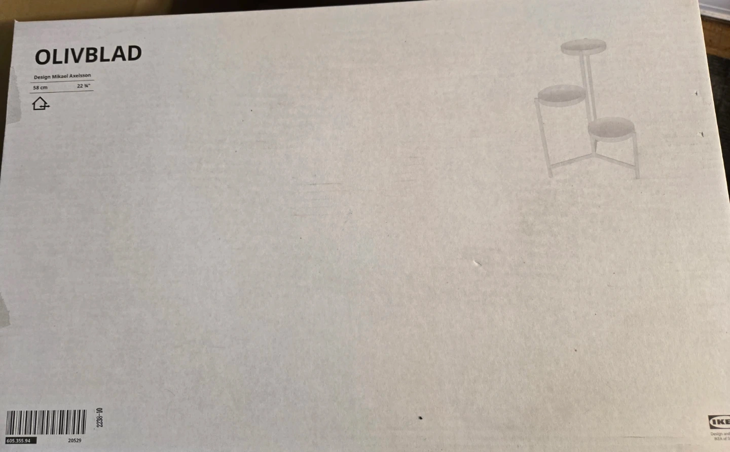 This is the IKEA OLIVBLAD plant stand. It's an off-white colour and suitable for indoor or outdoor use. The stand is 58 cm (22 3/4") tall and has three tiers for displaying plants. It's a limited edition item!