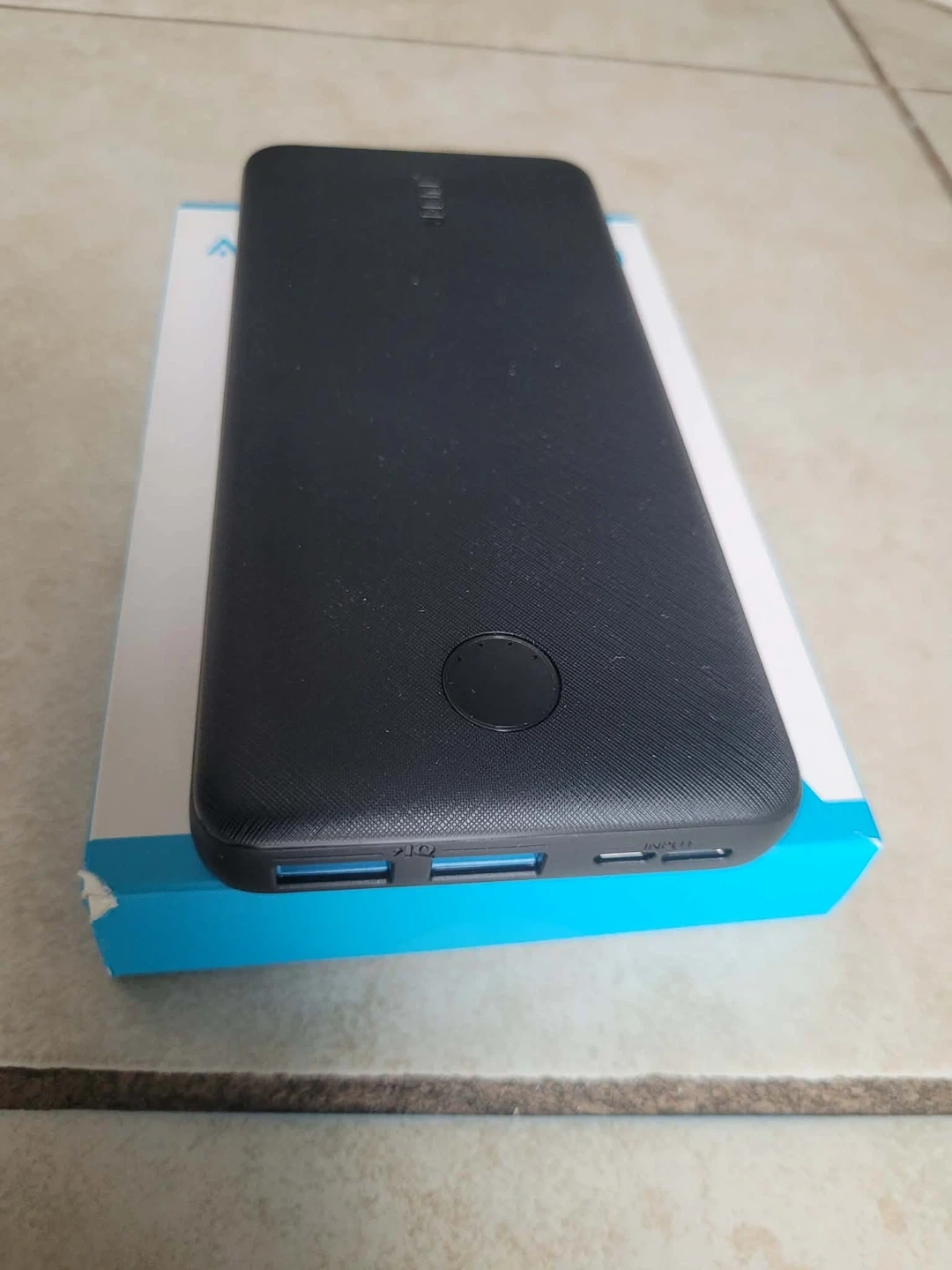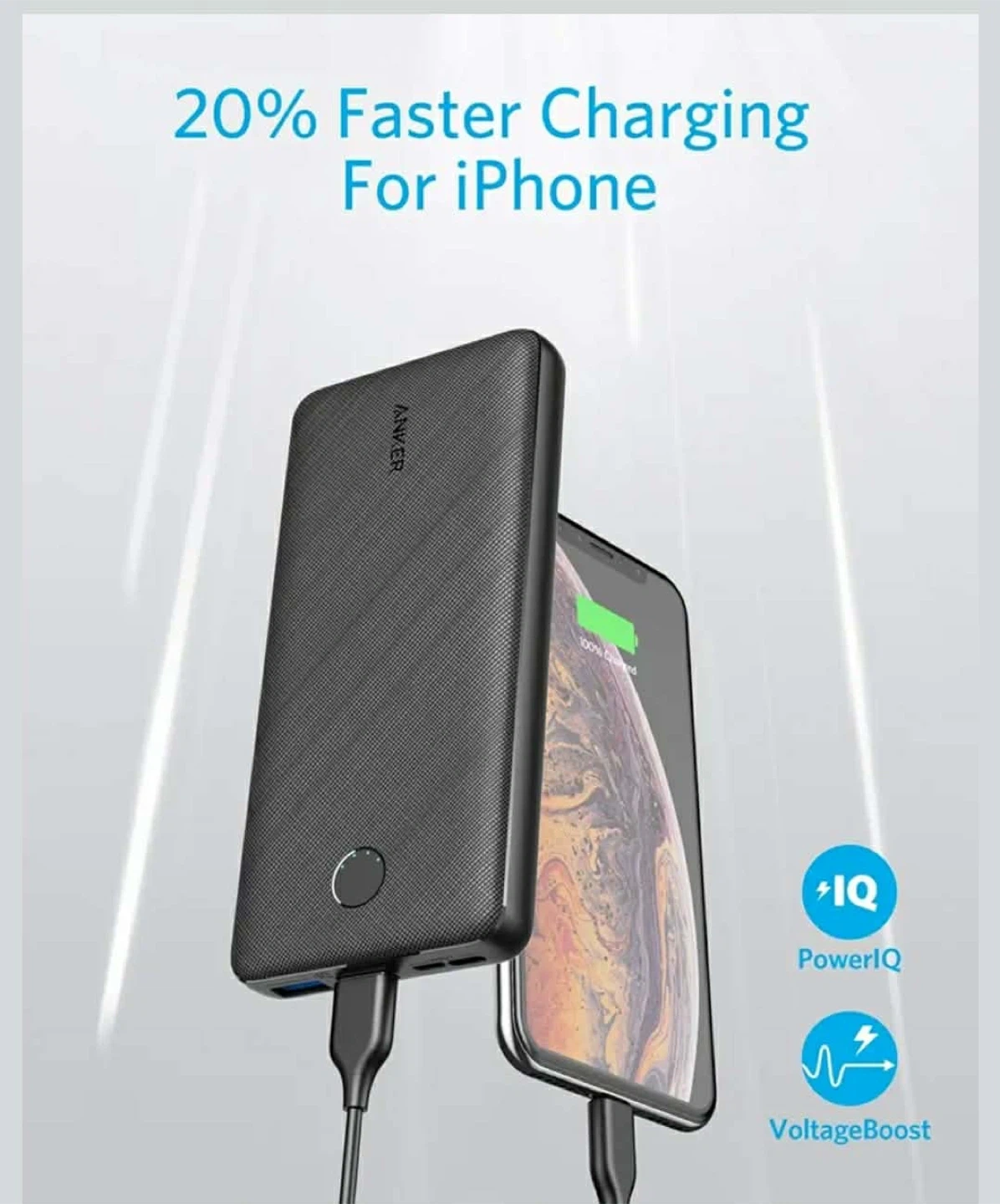 This Anker PowerCore Essential power bank has a 20,000mAh capacity. It offers 20% faster charging for iPhones and features PowerIQ and VoltageBoost technology. Multiple USB-A ports allow for simultaneous charging with a 15W maximum output.