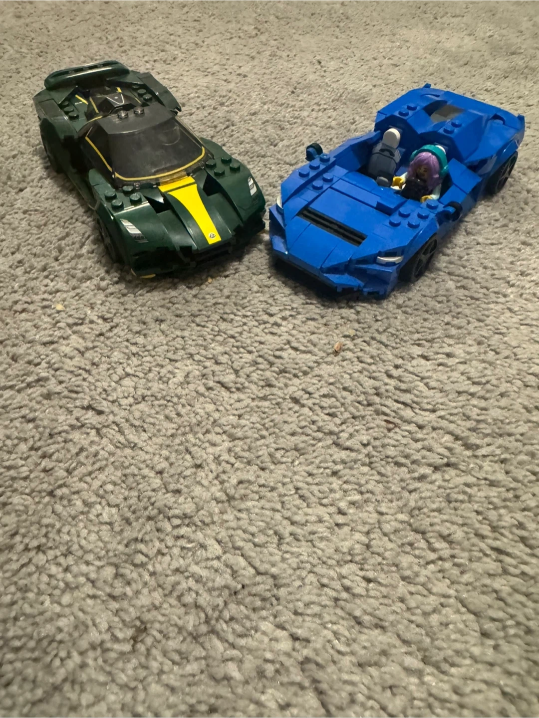 Two LEGO sports cars, one green with yellow accents and the other blue. Both are built with LEGO bricks. They're great for display or imaginative play!