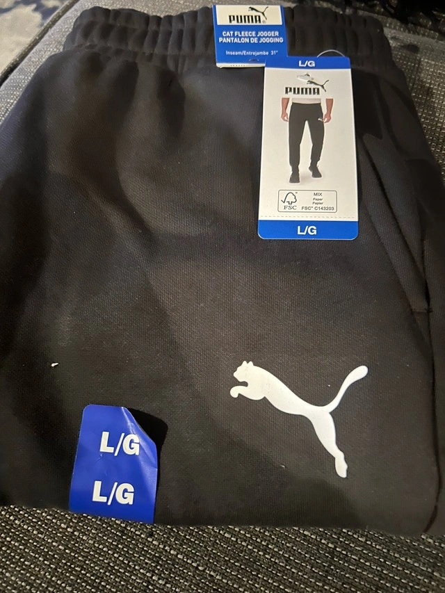 Features a drawstring at the waist, rib cuffs and hem, and the classic Puma cat logo on the upper thigh. Includes dual side pockets. Made from a comfortable 66% cotton and 34% polyester blend.