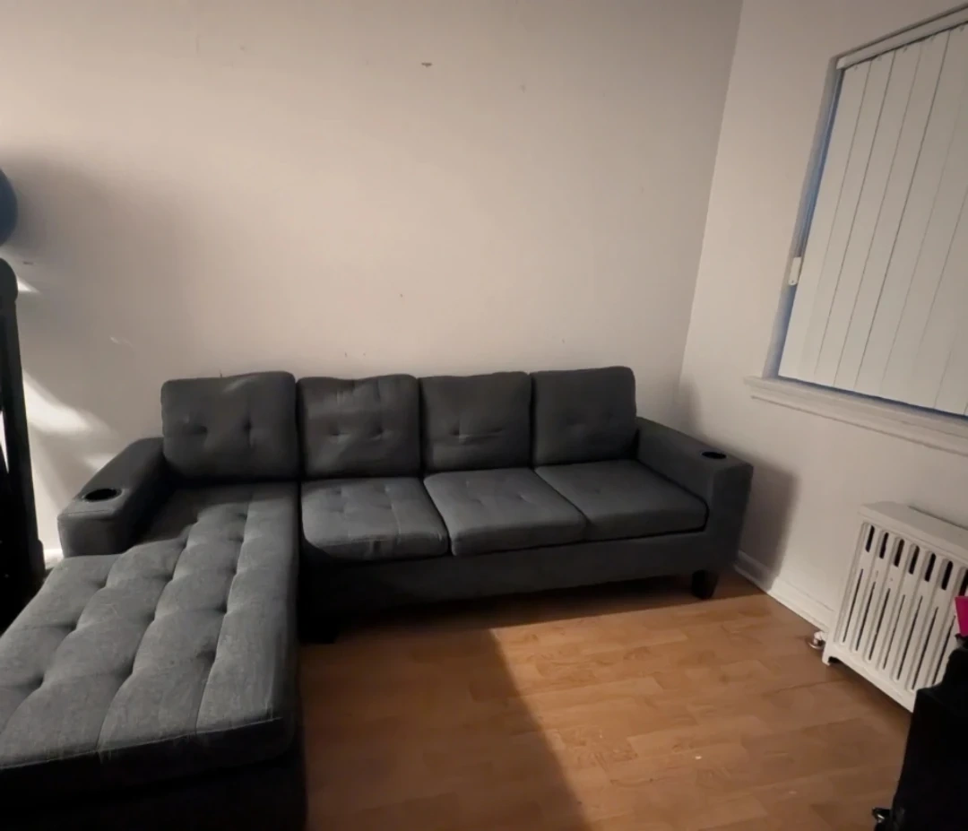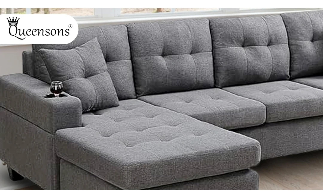 This Queensons sectional sofa comes in a versatile grey fabric. It features a chaise for extra lounging space and convenient cup holders built into the armrest. The tufted cushions add a touch of style.
