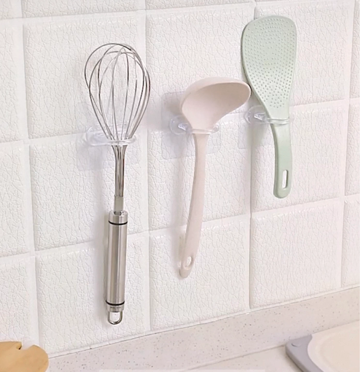 These adhesive hooks are perfect for organizing your kitchen, bathroom, or closet. They can support up to 20kg and are made of clear plastic with a durable adhesive backing. Suitable for glass, metal, ceramic, and marble surfaces. Not recommended for painted walls.
