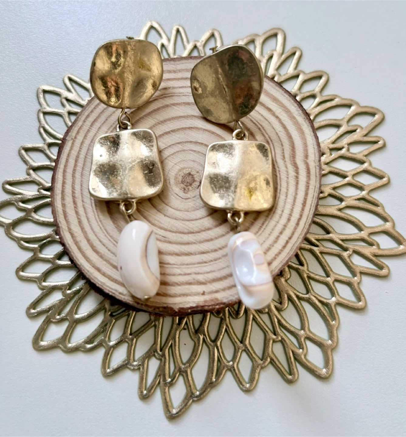 Matte Gold tone earrings featuring geometric shapes and natural white shell beads. They have a post back closure.
