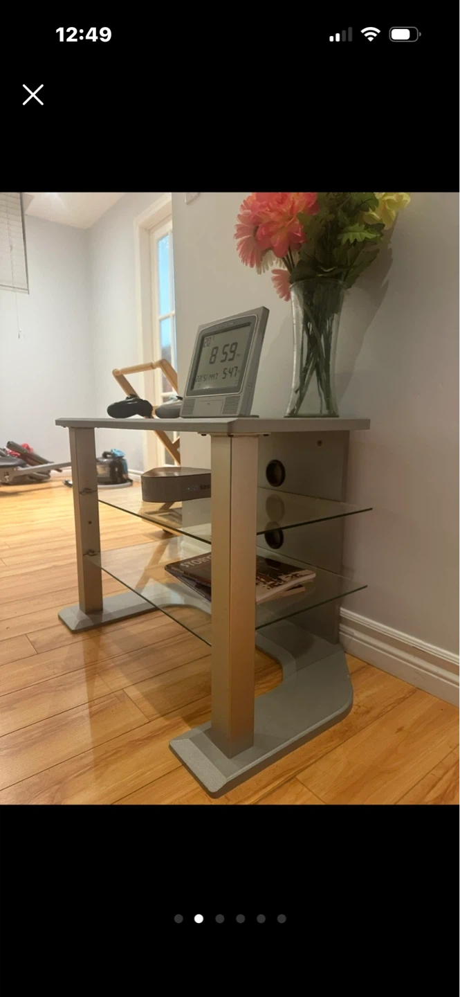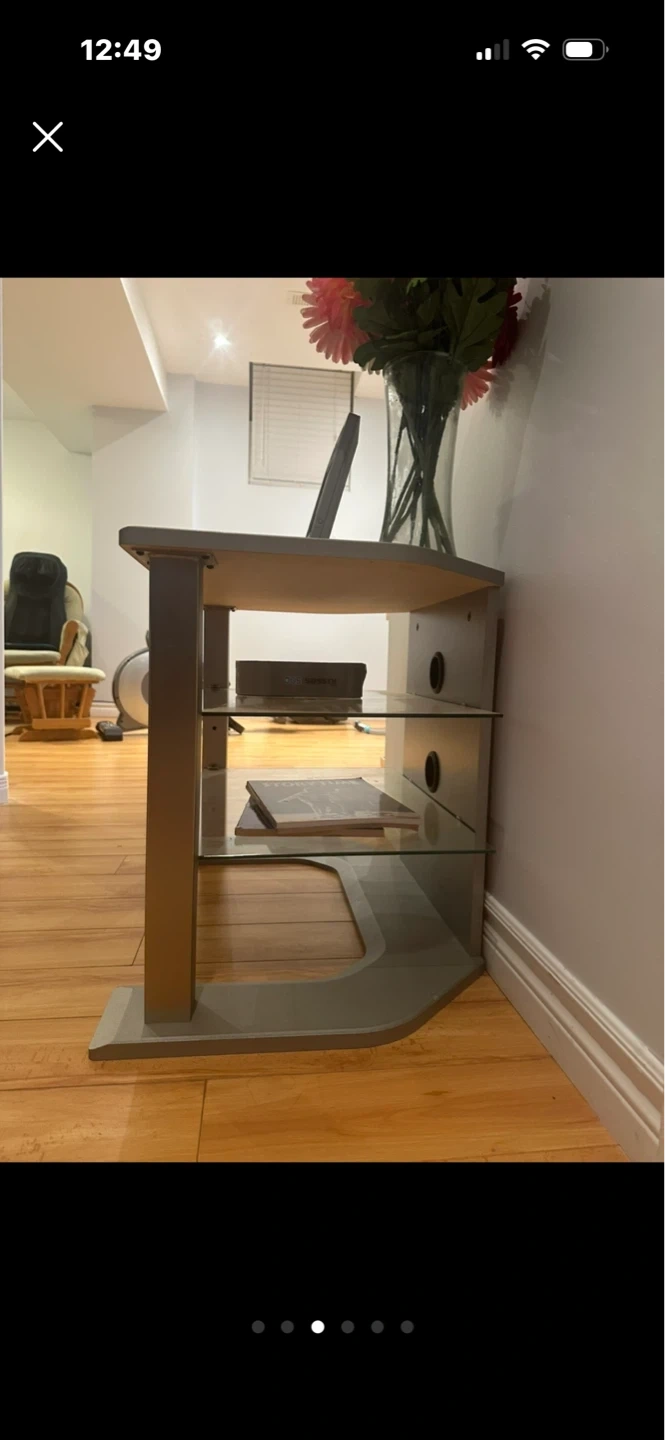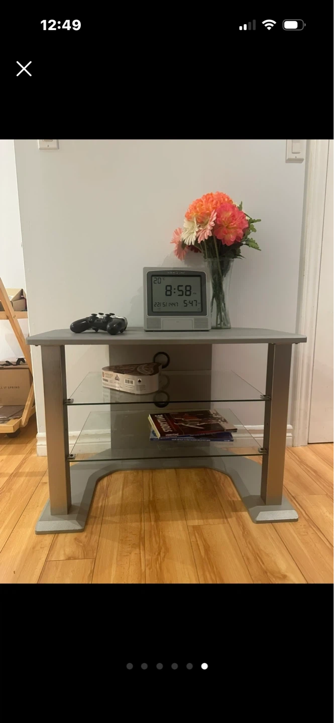 Selling a silver TV stand that's perfect for your living room or entertainment area! It features sturdy construction and sleek glass shelves, providing ample space for your media devices, gaming consoles, or decorative items. It's in great condition and ready to find a new home
