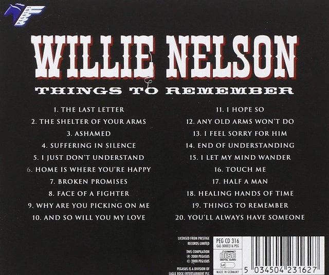 Audio Music CD Willie Nelson "Things to Remember". Made in Germany. Pegasus: PEG CD 316. Still in original shrink wrap. Selling price: $10. Cash or cashless payment accepted. Owner selling. Curbside pickup available. Drop off/delivery possible.