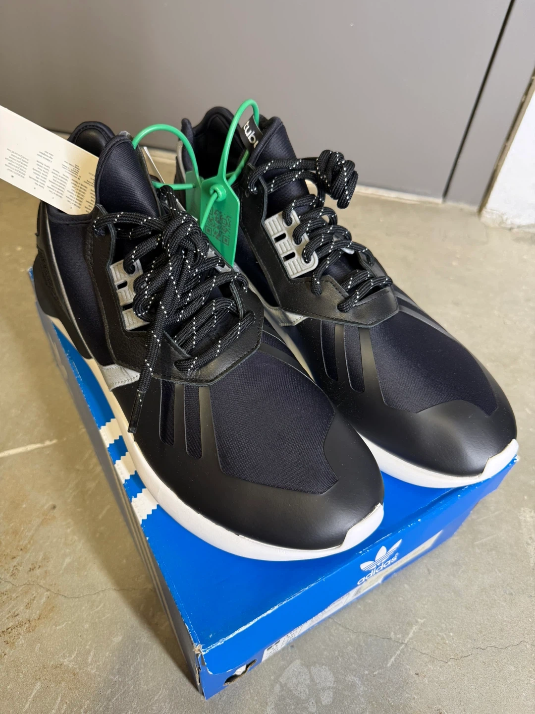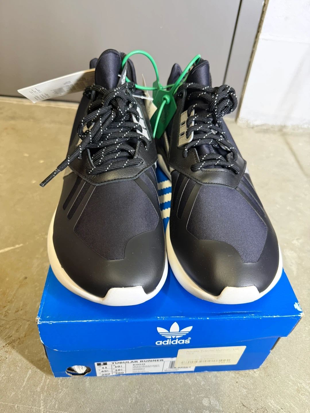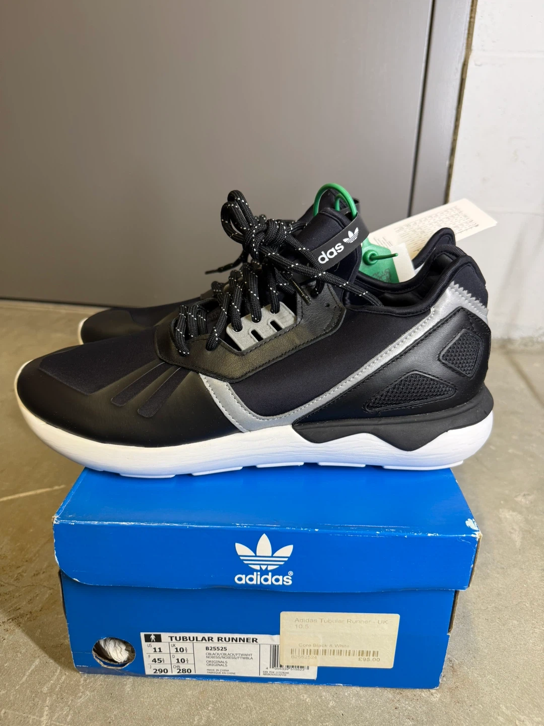 Adidas Tubular Runner sneakers in black, white, and silver. Includes original box and tags. Men's size 11 (UK 10.5, EUR 45, 290mm). These shoes are perfect for everyday wear. Discounted because its age. NEW.