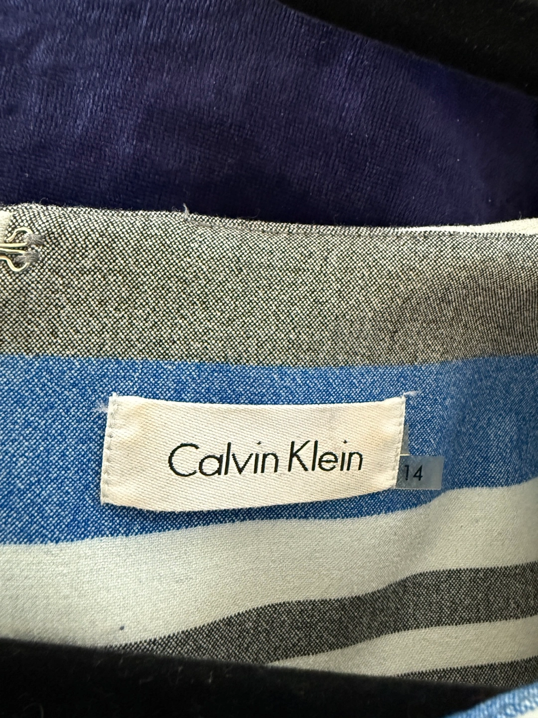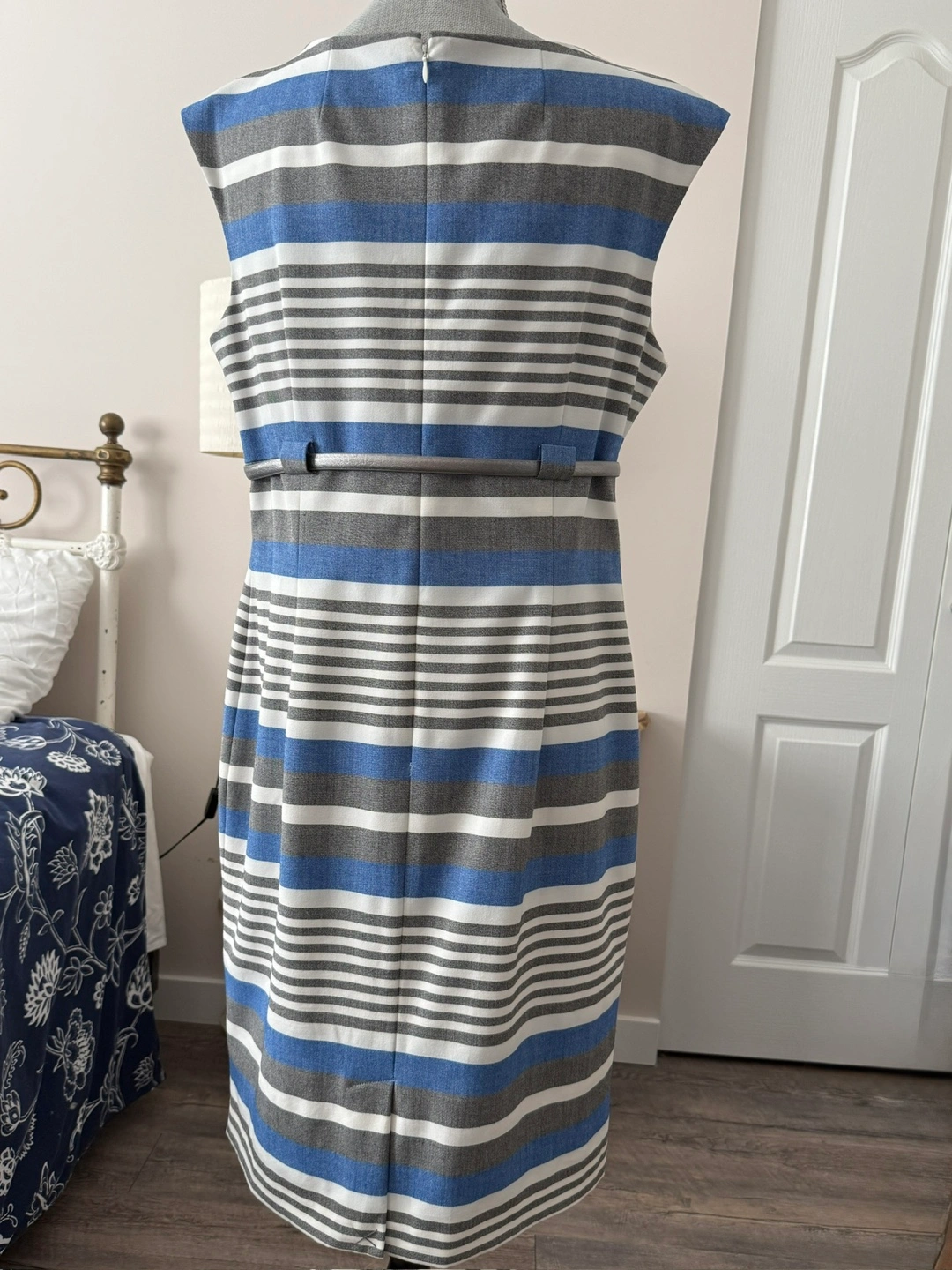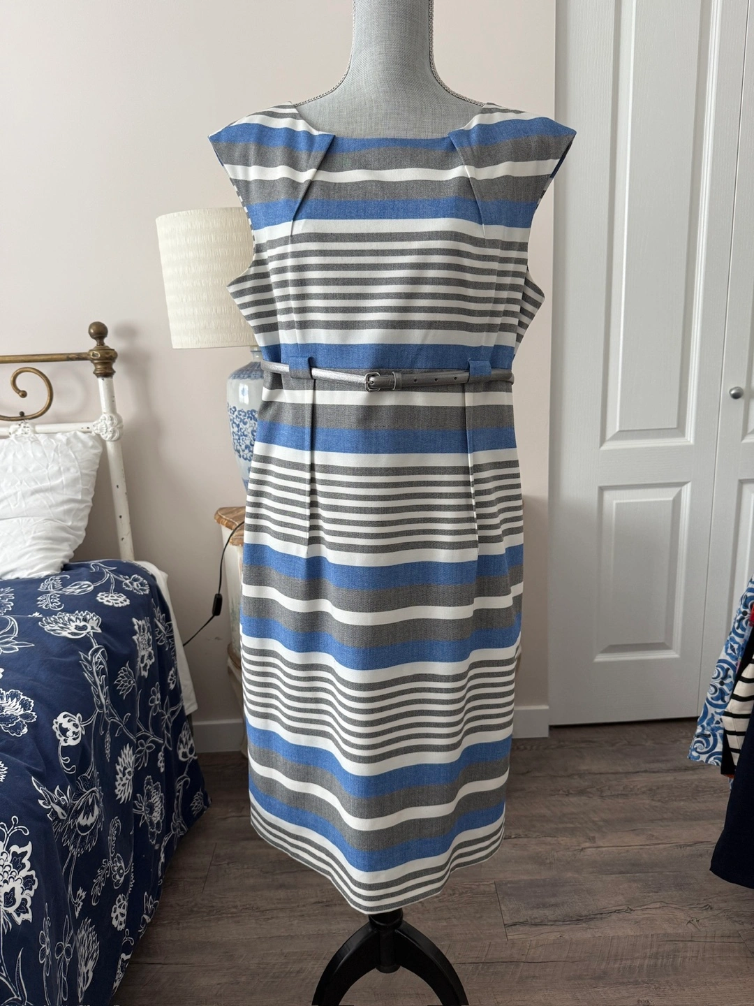 Calvin Klein lined sleeveless dress with blue, grey, and white stripes. Has a rear split at hem. Includes a matching belt. Fabric is Rayon, spandex, polyester blend.