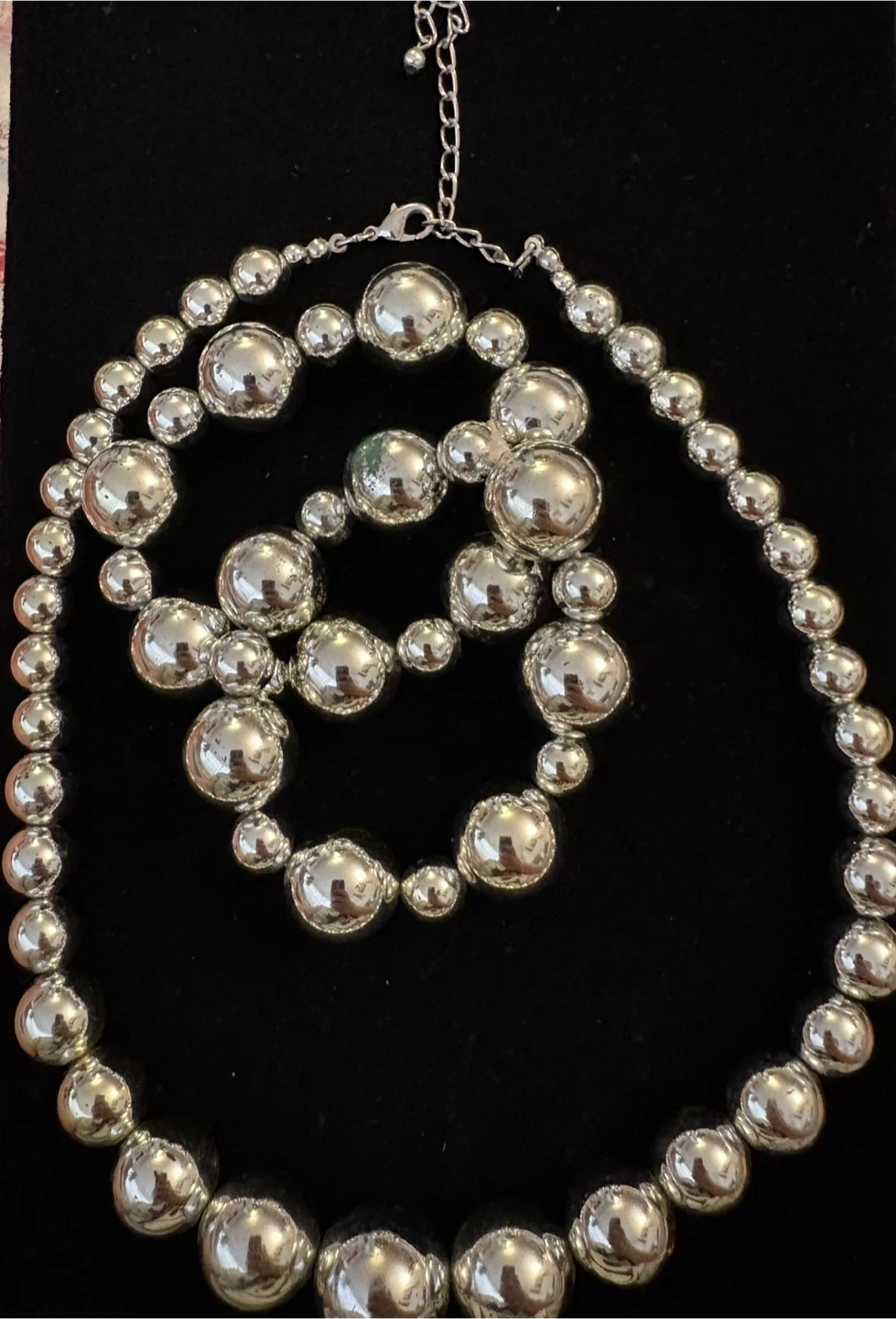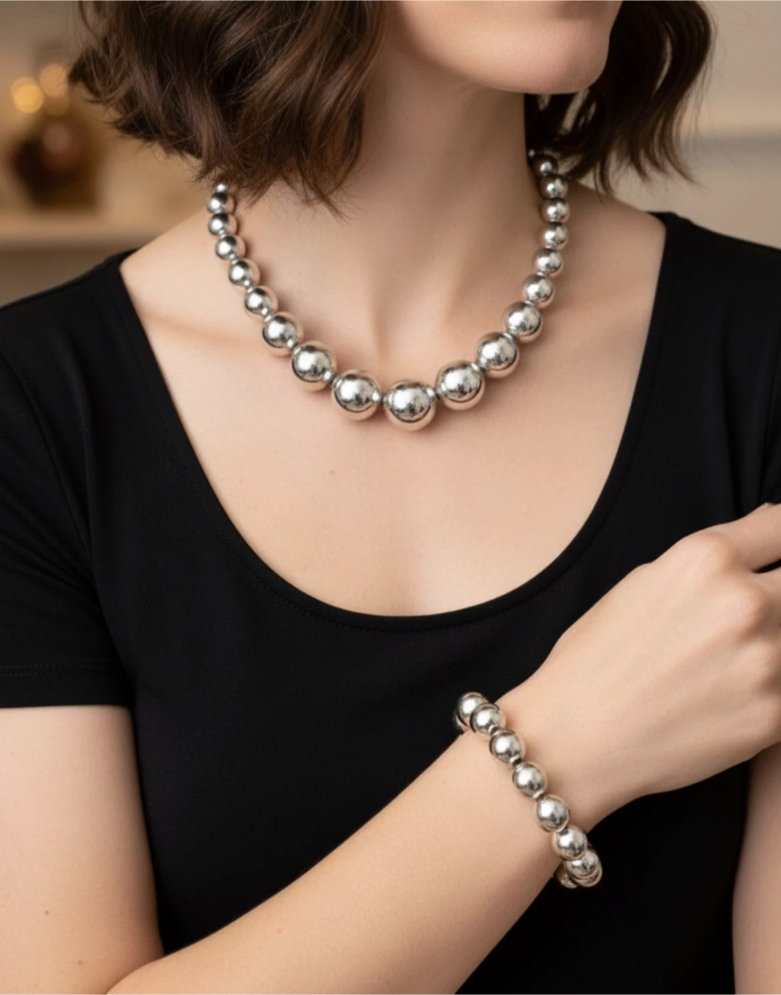 This set includes a necklace and a matching bracelet, both made with silver-tone beads. The beads are spherical and vary in size.