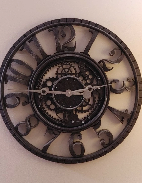 Large wall clock. Industrial style exposed gears. Operates with quartz accuracy.