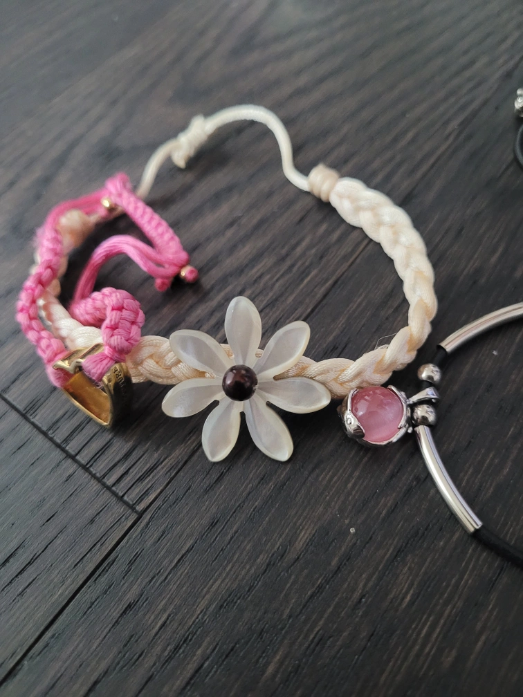 Set of 2 bracelets that are braided cords. The necklace is black with a pendant. The bracelets have a pink flower accent and a heart charm.