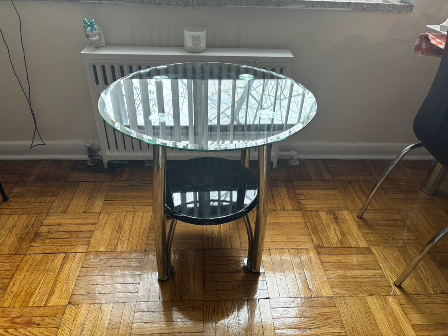 This accent table has a clear glass top and a black lower shelf with chrome legs. It's perfect for a small space or as a side table. The round glass top is a nice touch!