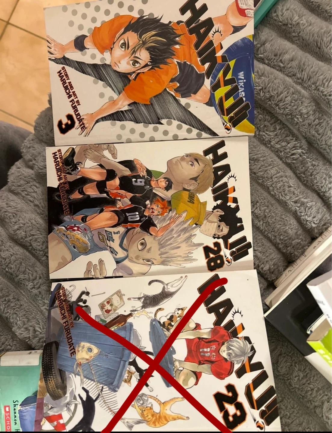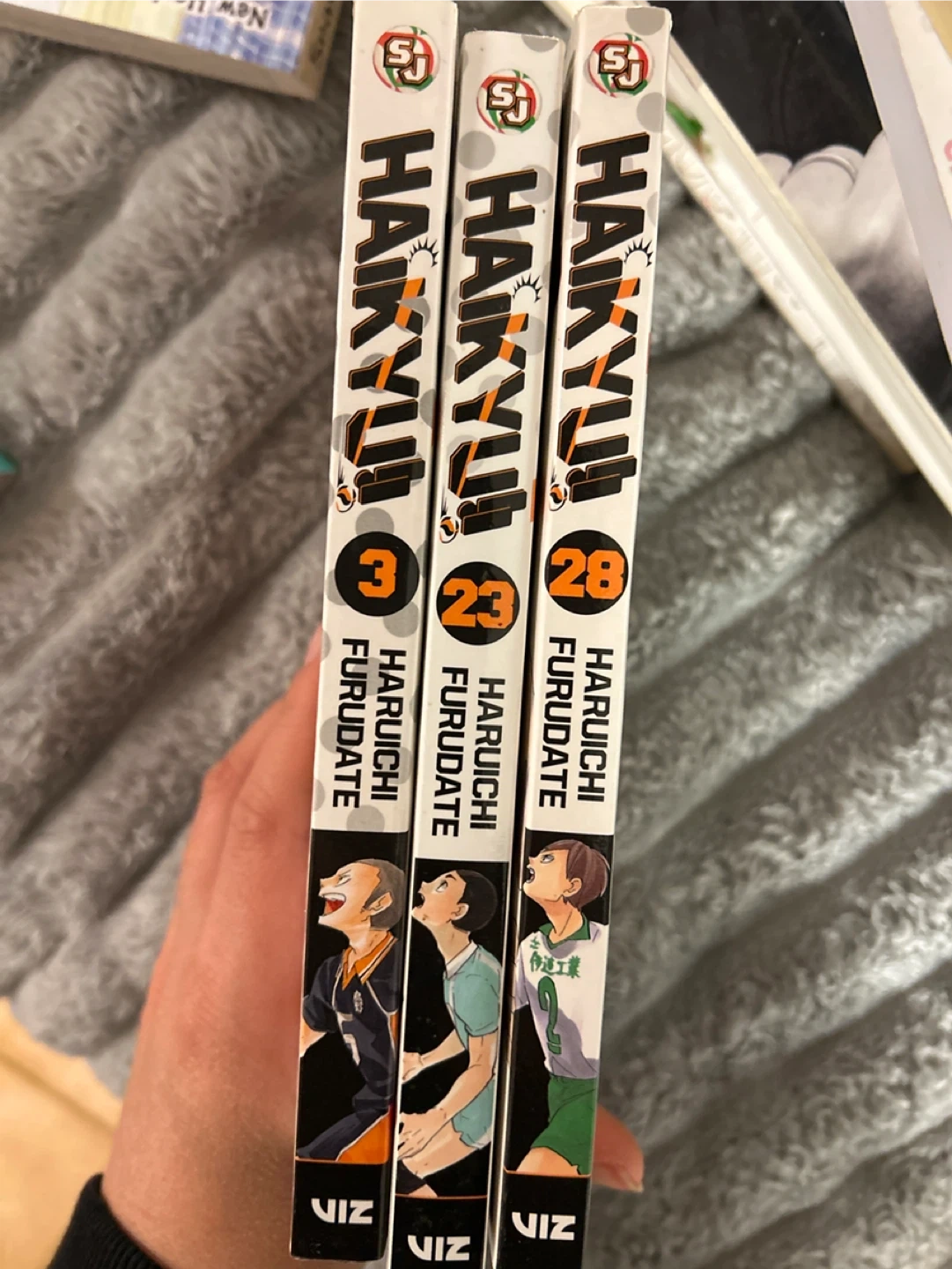 Three volumes of the popular Haikyu!! manga series by Haruichi Furudate. Includes volumes 3, 23, and 28. Published by VIZ Media.
