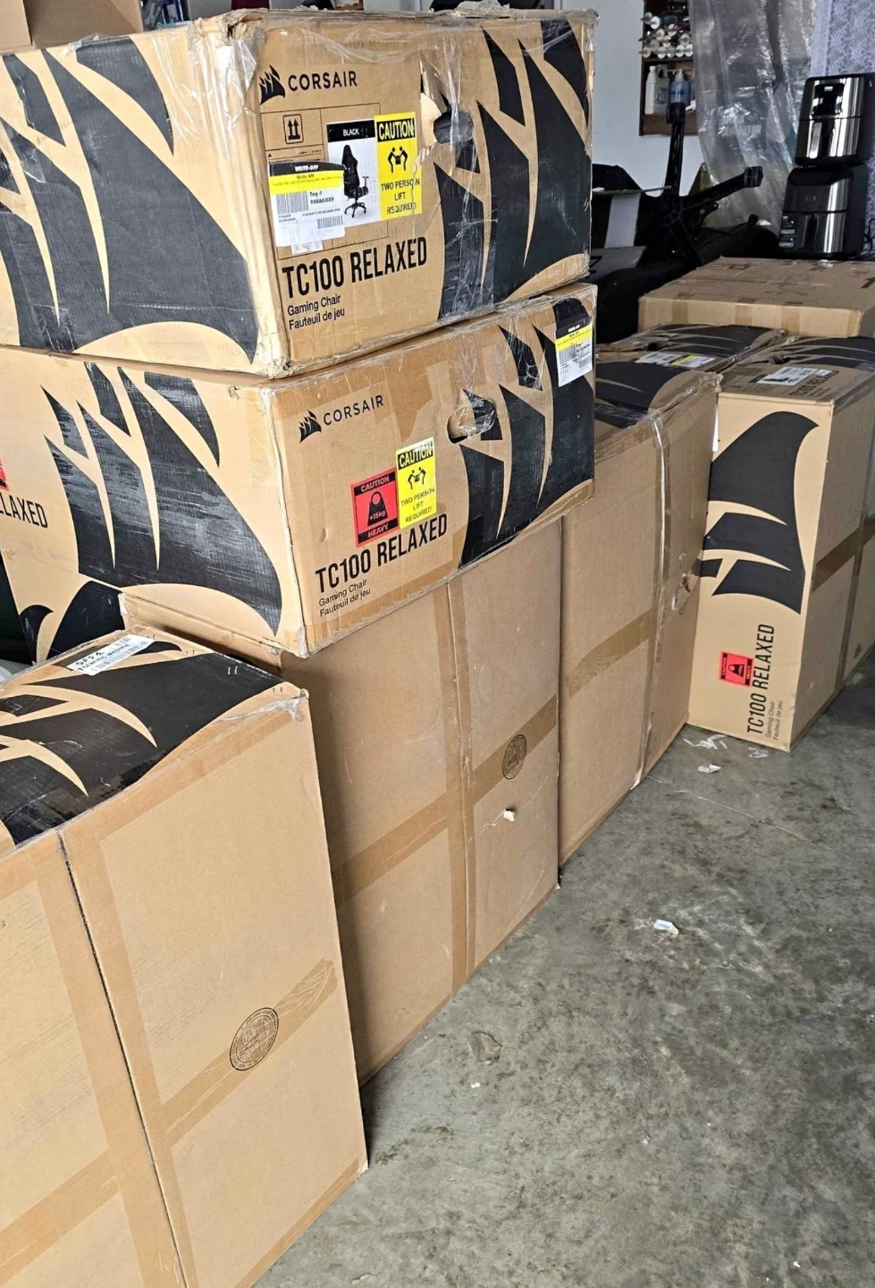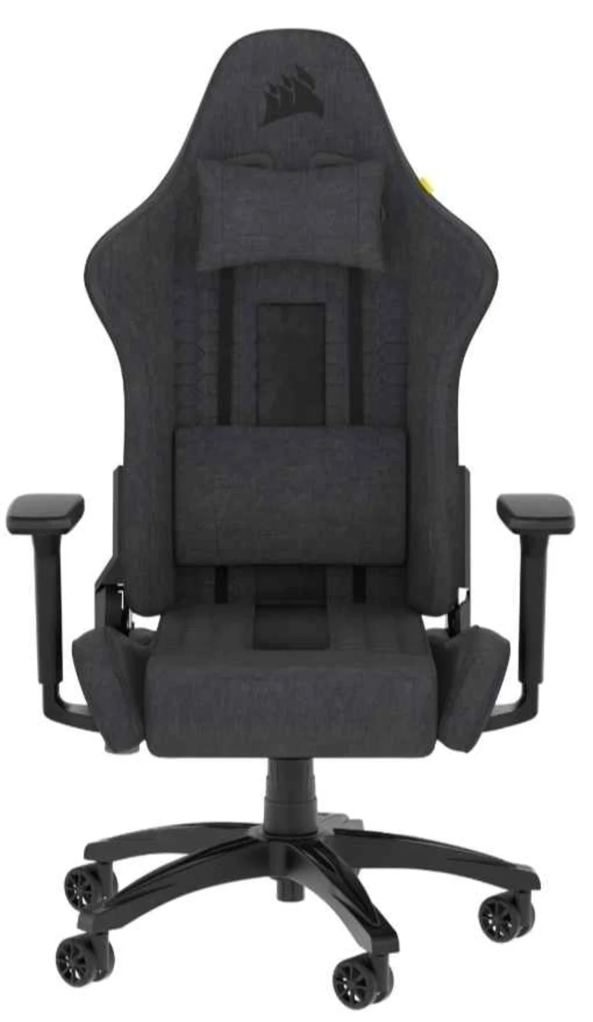 New in box Corsair TC100 RELAXED ergonomic gaming chair. It's upholstered in grey fabric. Includes a lumbar pillow and neck pillow for comfort. This chair is built for long gaming sessions!