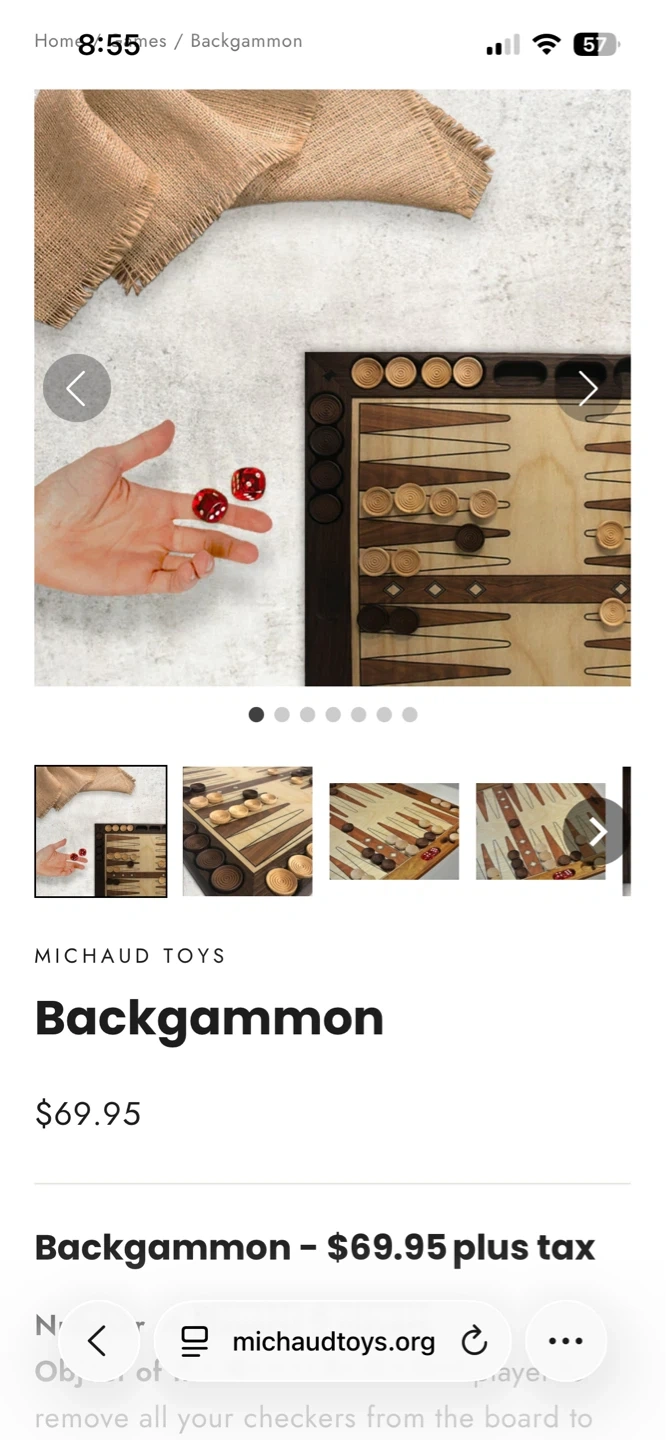 Buy & SellMichaud Toys Backgammon - NEWMichaud Toys Backgammon - NEW$65Wooden backgammon game by Michaud Toys Brand new, still in original packaging $65ConditionNewWHERE TO MEETParker st parkView MapSELLERTeaganWestern Hill423 reviews0 chats·0 favorites·2 viewsSEND CHAT TO SELLERHi Teagan! I’m interested in your listing.Hi Teagan! I’m interested in your listing.Get the Karrot app to chatSign In to chat