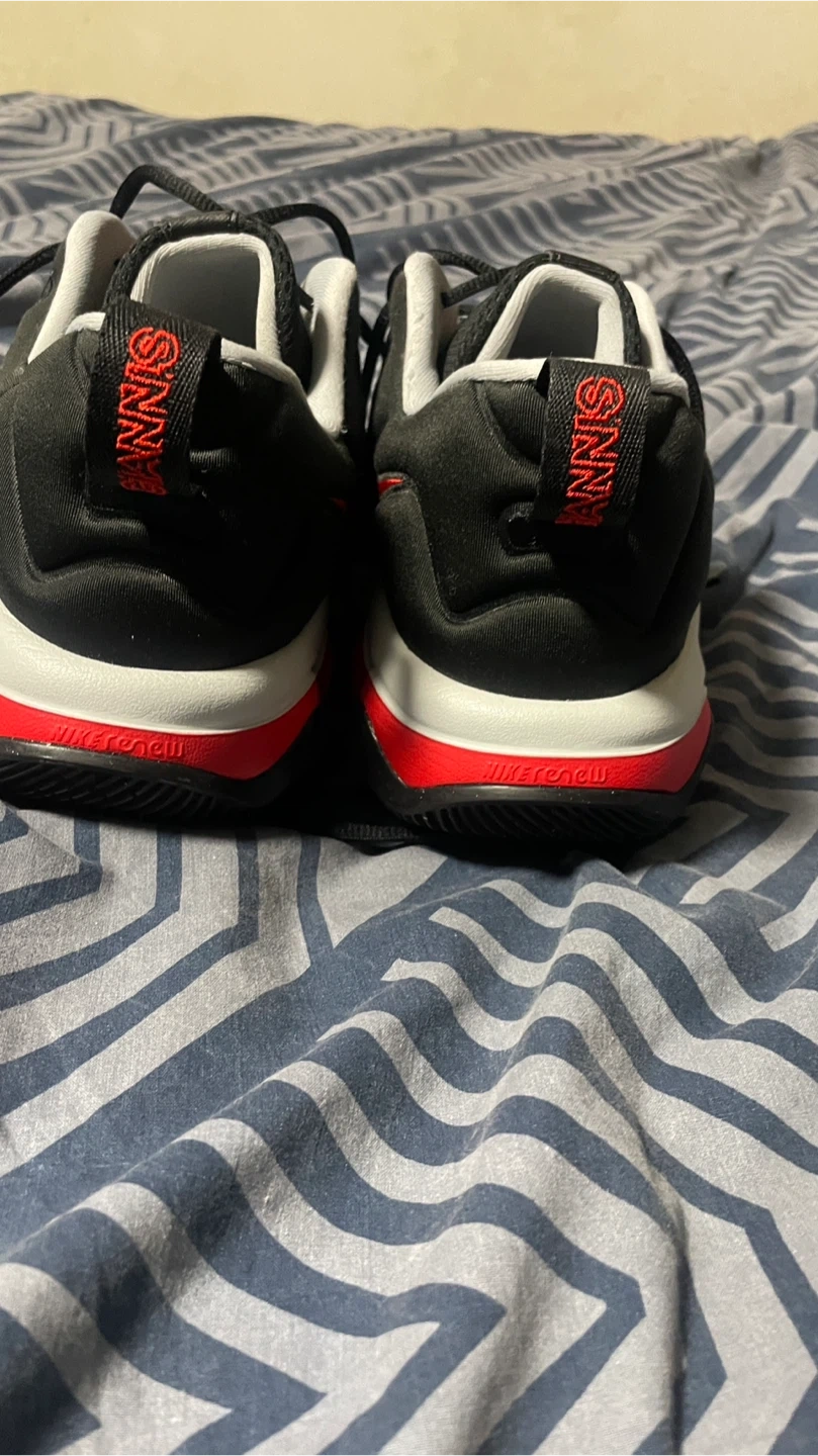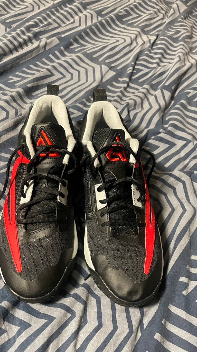 These Giannis Immortality 3 Shoes are black with red accents. They feature a lace-up closure and a durable sole. The size is 10.
