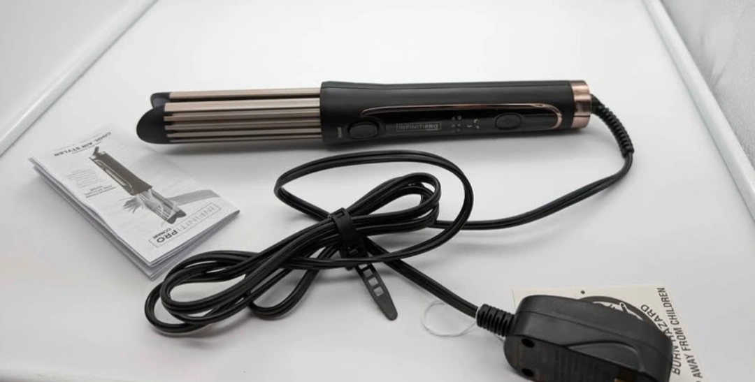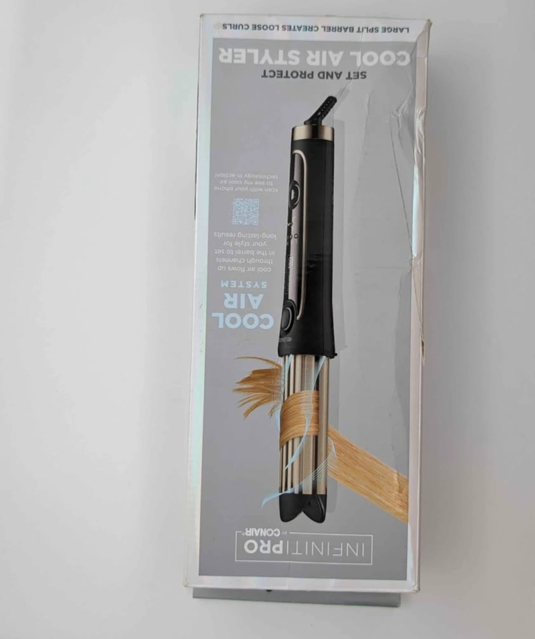 New, in box. Large barrel. Creates loose curls. Set and protect. Cool air system. Includes instruction manual and power adapter.