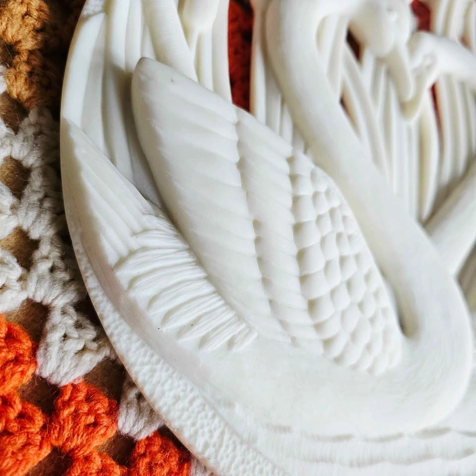 Beautiful vintage 1970s handcrafted 3D sculpture decor piece from Coralei Hawaii, made of ivory/ cream cultured coral. Sculpture features a graceful design of two 'lovebird' swans in water, surrounded by cattails, holding their necks in the shape of a heart.