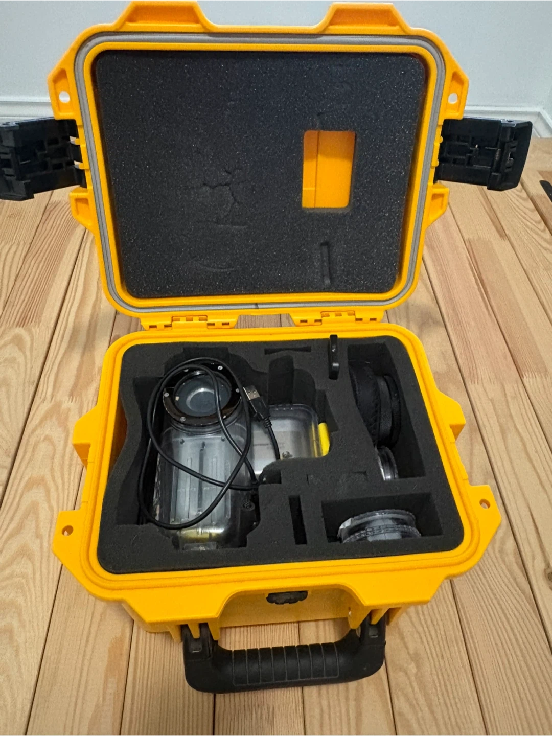 This is a Bonica underwater camera housing. It comes with a protective case and various accessories. It's designed for capturing photos and videos underwater.