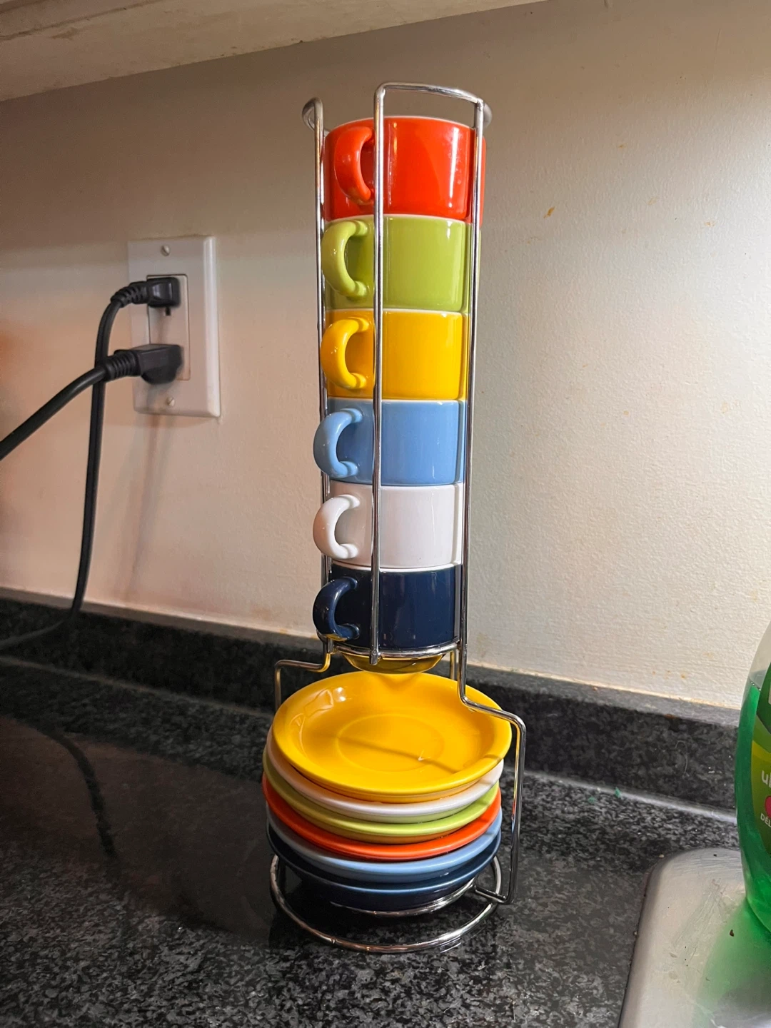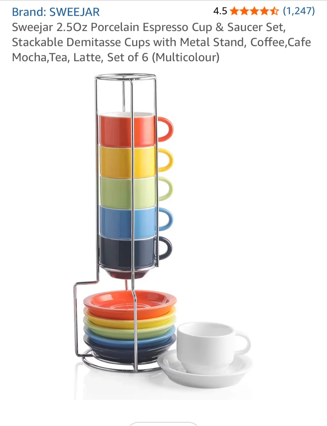 Six stackable porcelain demitasse cups with matching saucers in a metal stand. Cups are 2.5oz capacity. They come in a multicolour set. Porcelain material.