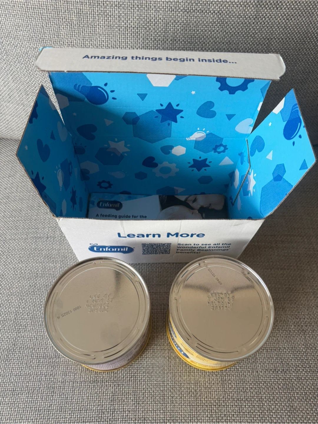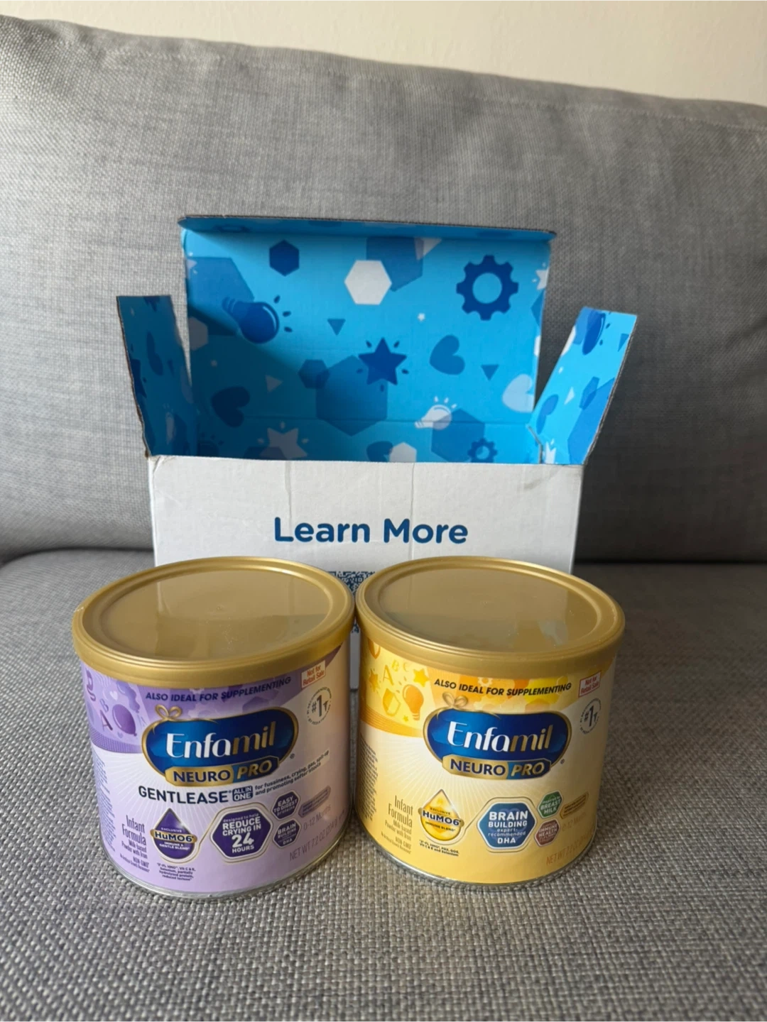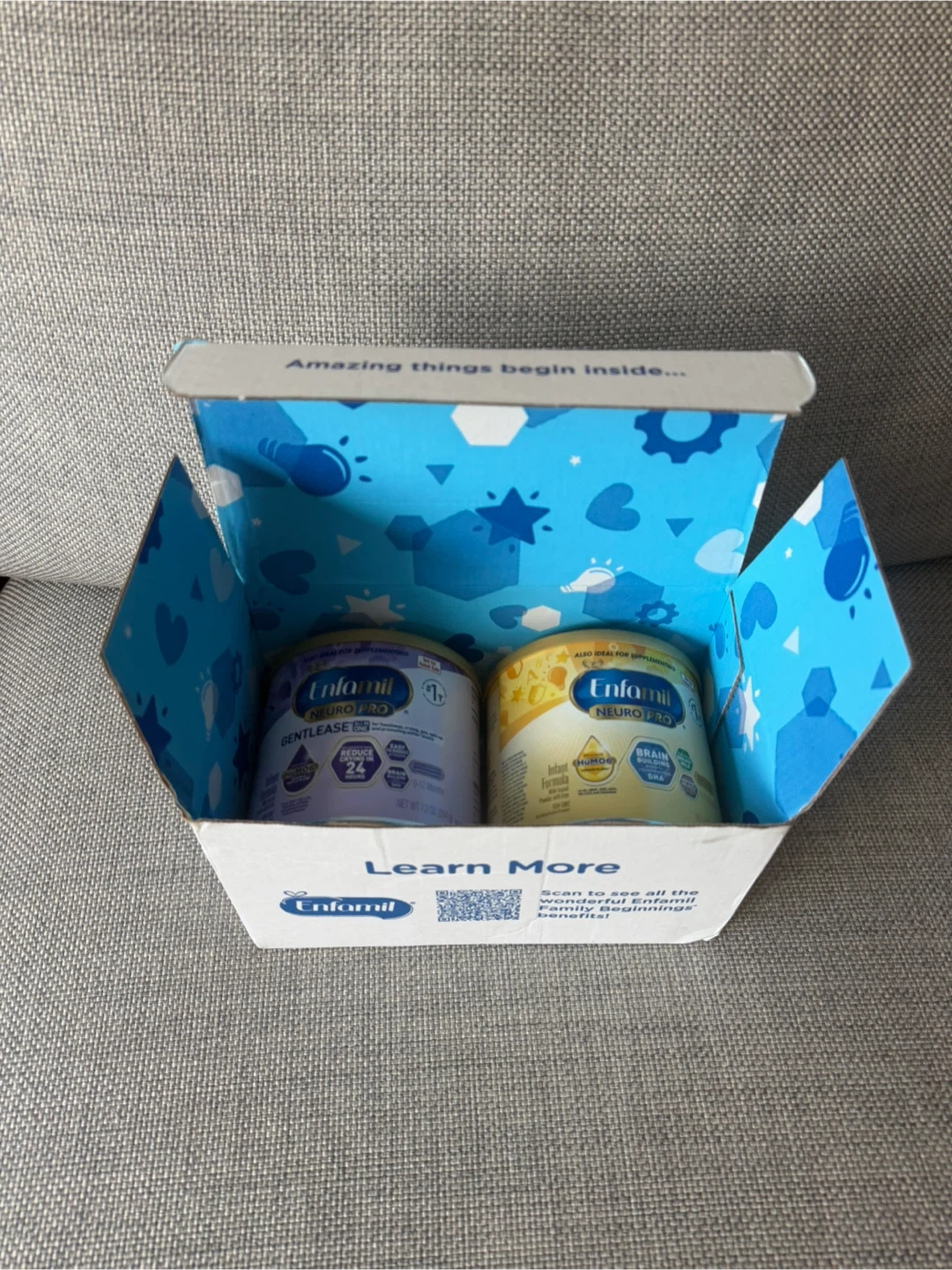 Enfamil Wonder Box with 2 sealed formula cans: NeuroPro Gentlease and NeuroPro Infant. Box opened for photos only.