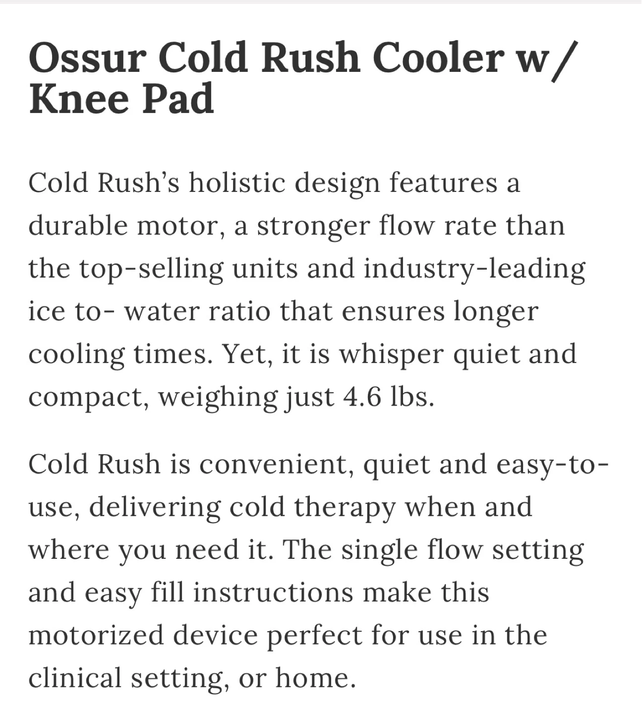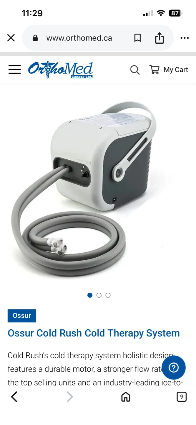 This Ossur Cold Rush system delivers cold therapy with a durable motor and strong flow rate. It's quiet and compact, weighing just 4.6 lbs. Includes the motorized device, pad, hoses, and power adapter. This is useful for pain relief and recovery.