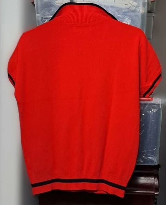 Elevate your wardrobe with this beautiful Made in Korea short-sleeve top . This piece is crafted from a high-quality textured knit in a vibrant primary red, accented by classic black contrast tipping.