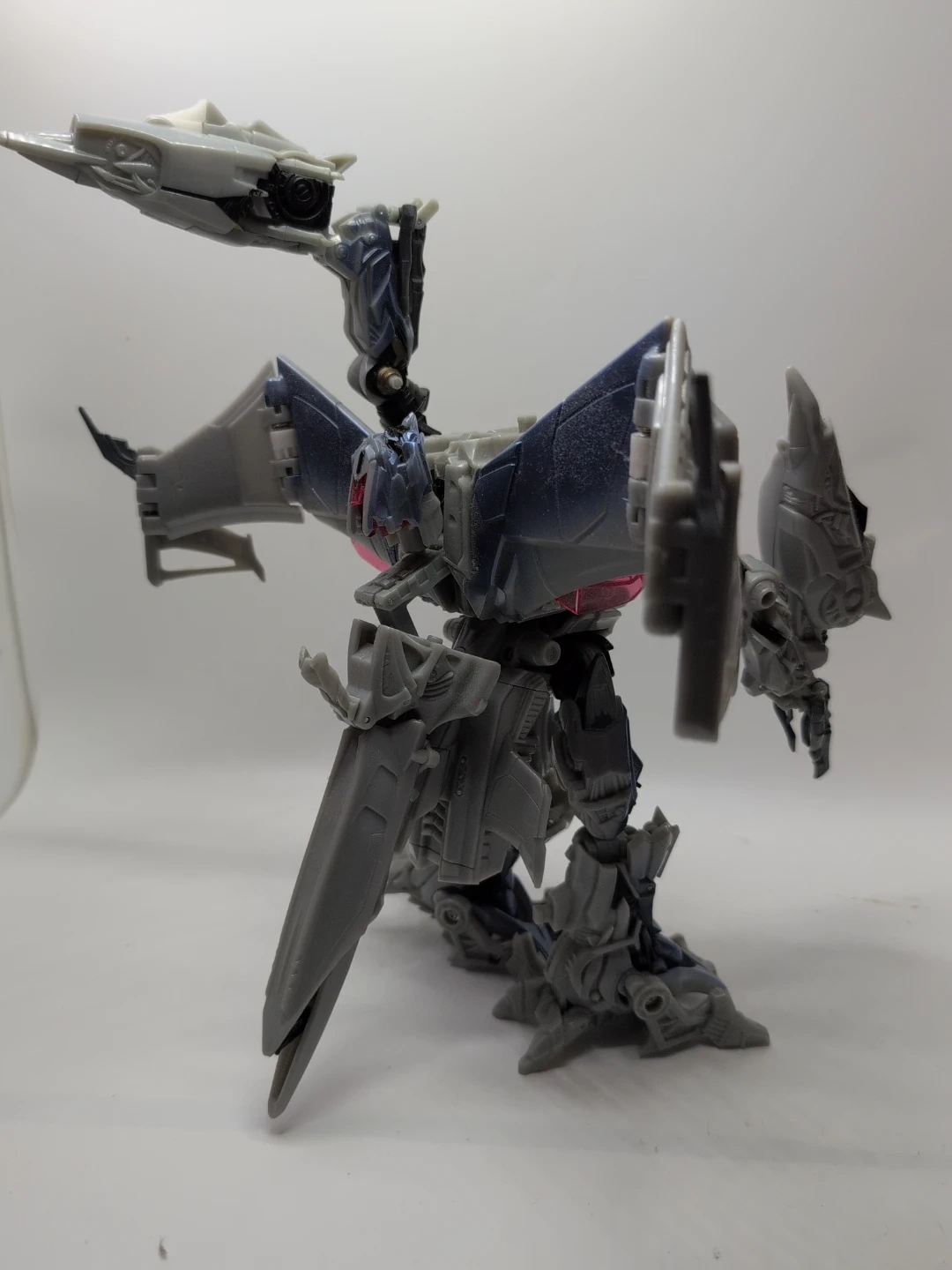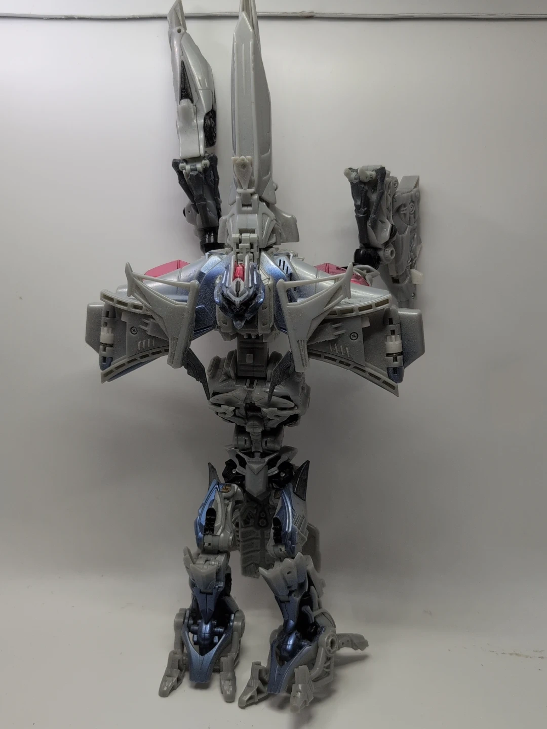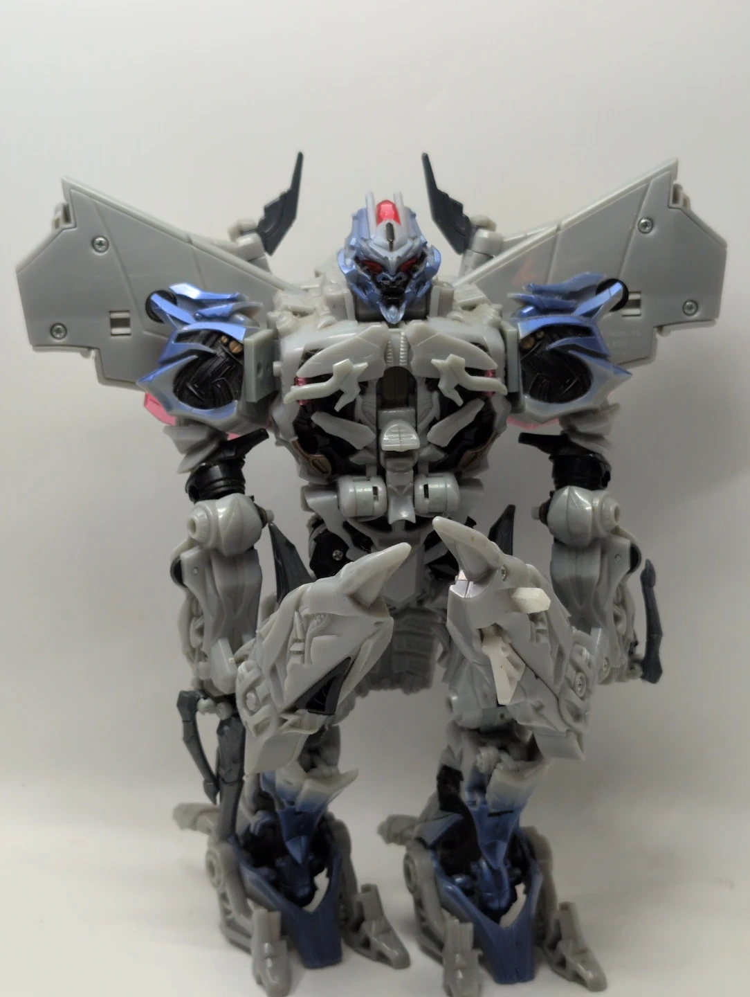 This is a grey and blue Transformers robot action figure. It's made of plastic and has intricate detailing. This toy is great for fans of the Transformers franchise who enjoy collecting action figures. Height about 15" width about 13"