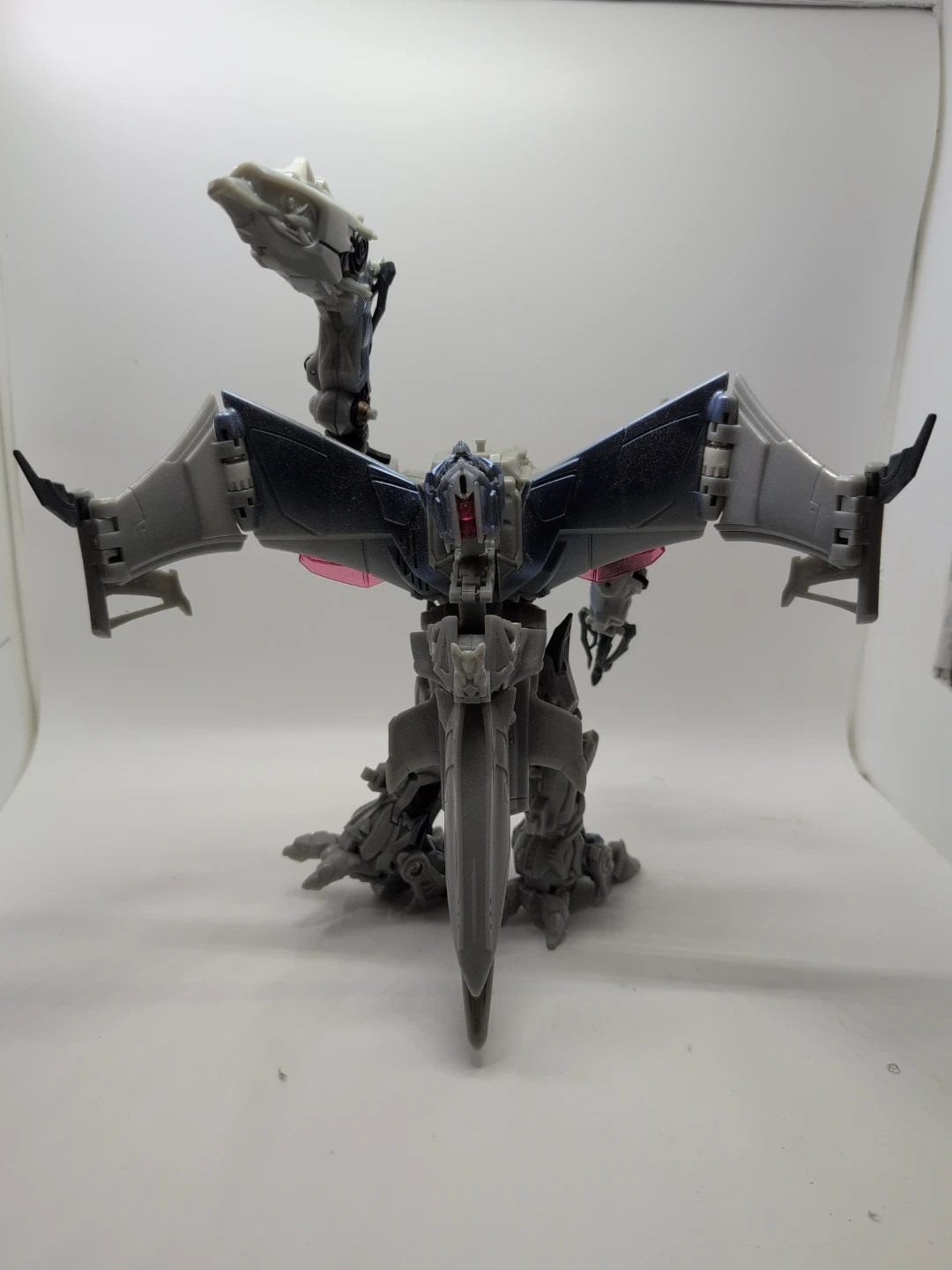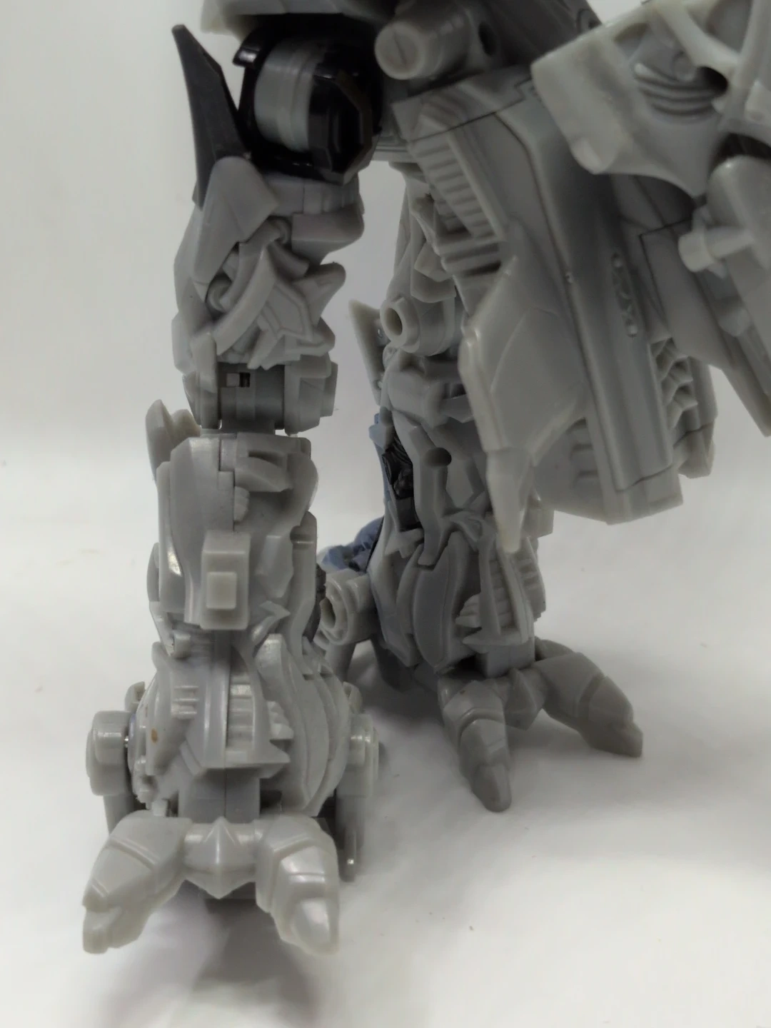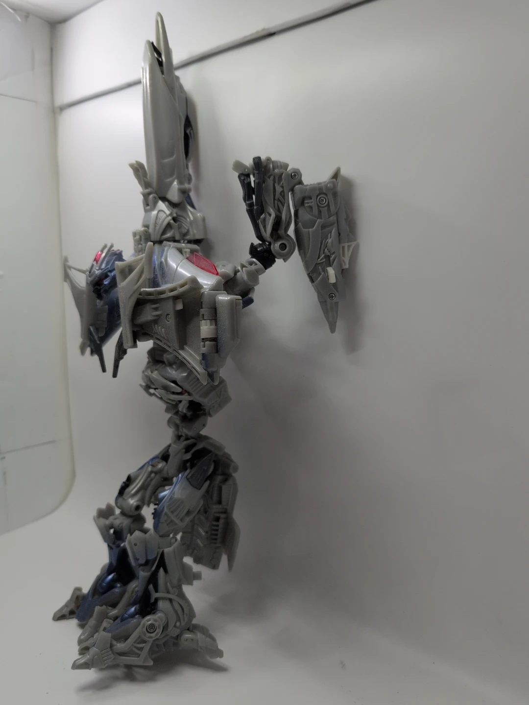 This is a grey and blue Transformers robot action figure. It's made of plastic and has intricate detailing. This toy is great for fans of the Transformers franchise who enjoy collecting action figures. Height about 15" width about 13"