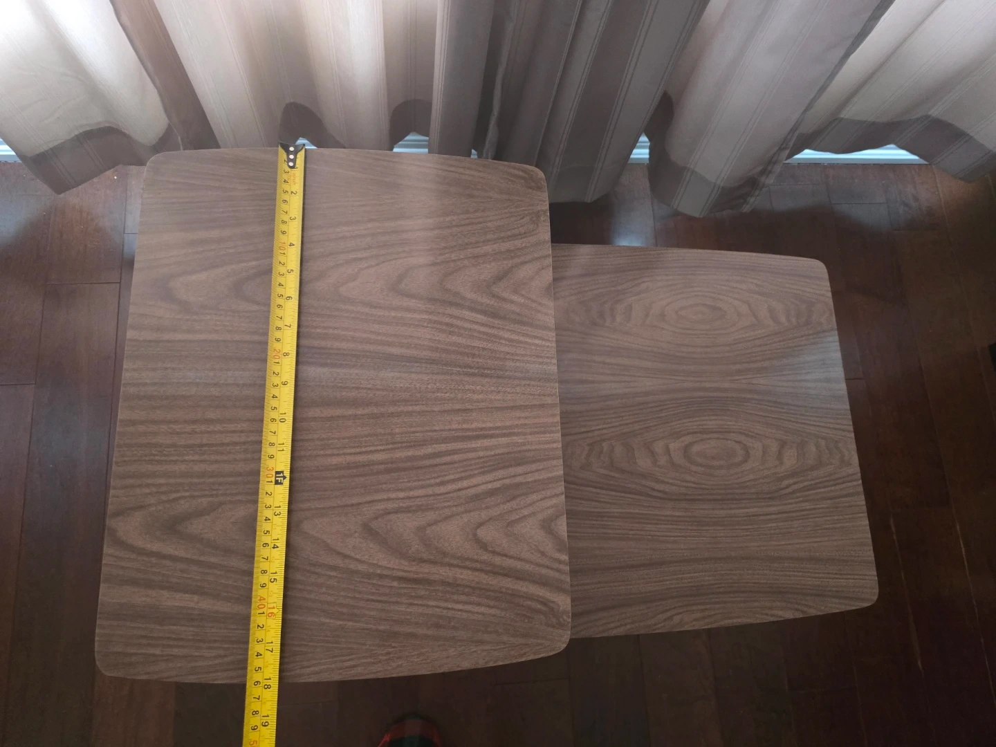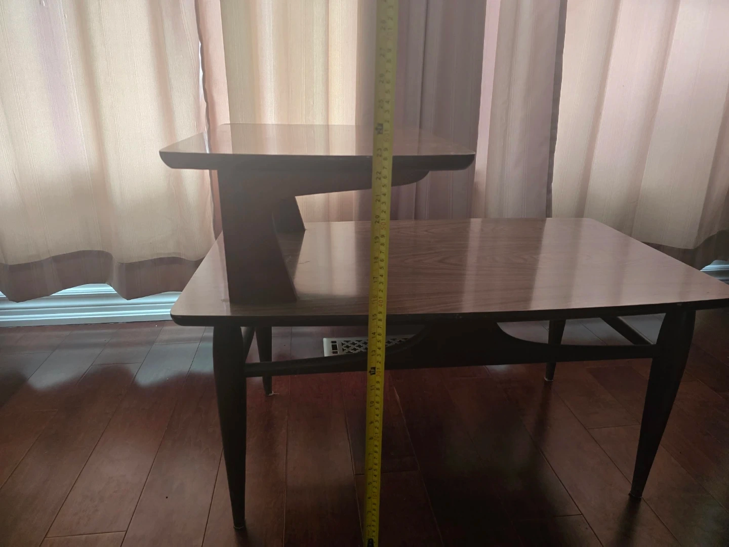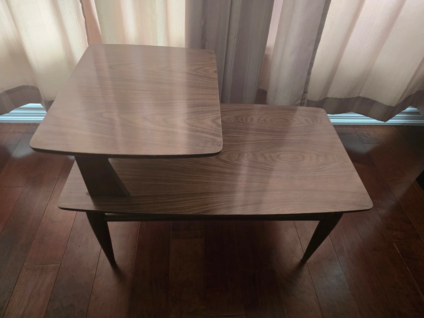 This vintage tiered side table features a wood-grain laminate finish. It's a two-tier design with tapered legs. The larger surface measures approximately 25 inches wide.