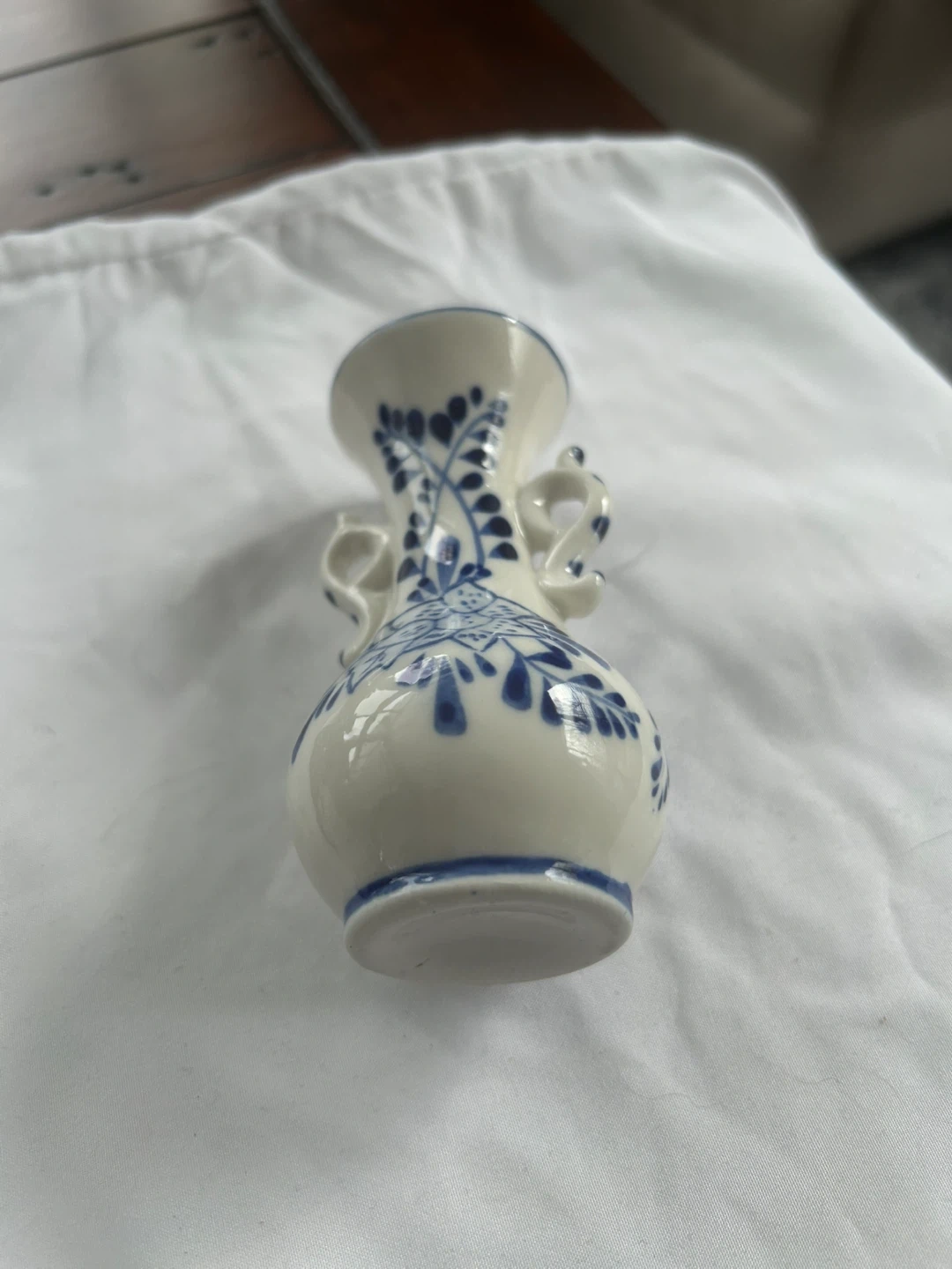 This is a sweet little ceramic /pottery vase with a blue and white floral design. It's perfect for a single flower or as a decorative accent piece. The vase has two small ornate handles on the sides.4” tall