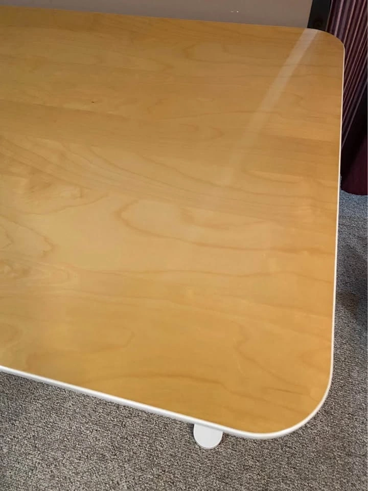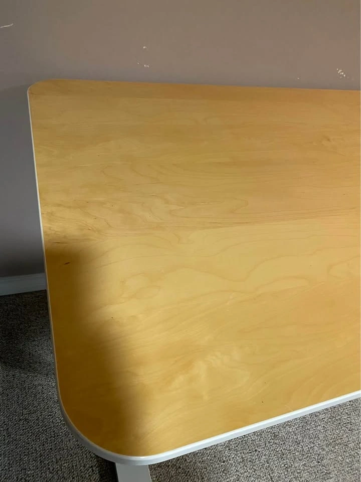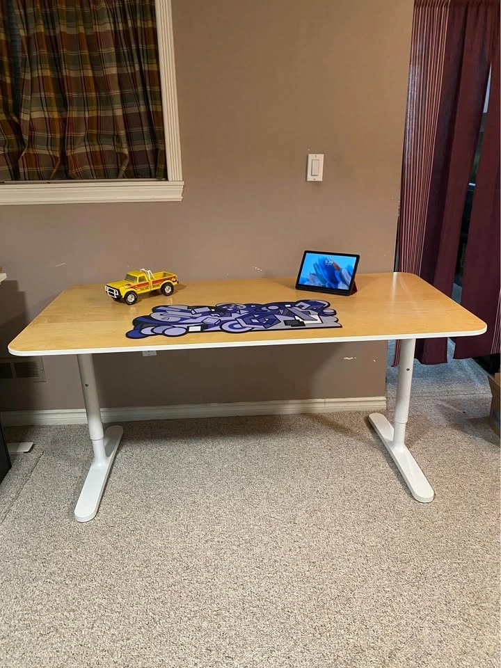 IKEA BEKANT desk. Adjustable height with allen key. Dimensions are 160cm x 80cm. Includes cable management net. There is a scratch on the side, shown in the last picture, but it's not too noticeable at an angle.
