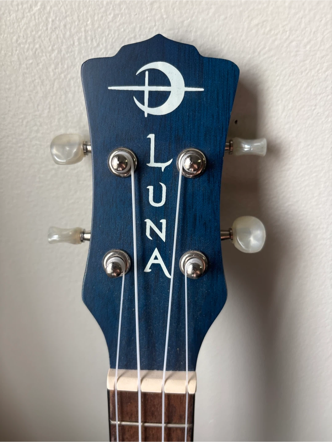 This is a Luna brand ukulele featuring a beautiful "The Great Wave off Kanagawa" graphic. It has a blue headstock with the Luna logo and white tuning pegs. It's a great instrument for beginners or enthusiasts looking for a unique uke!
