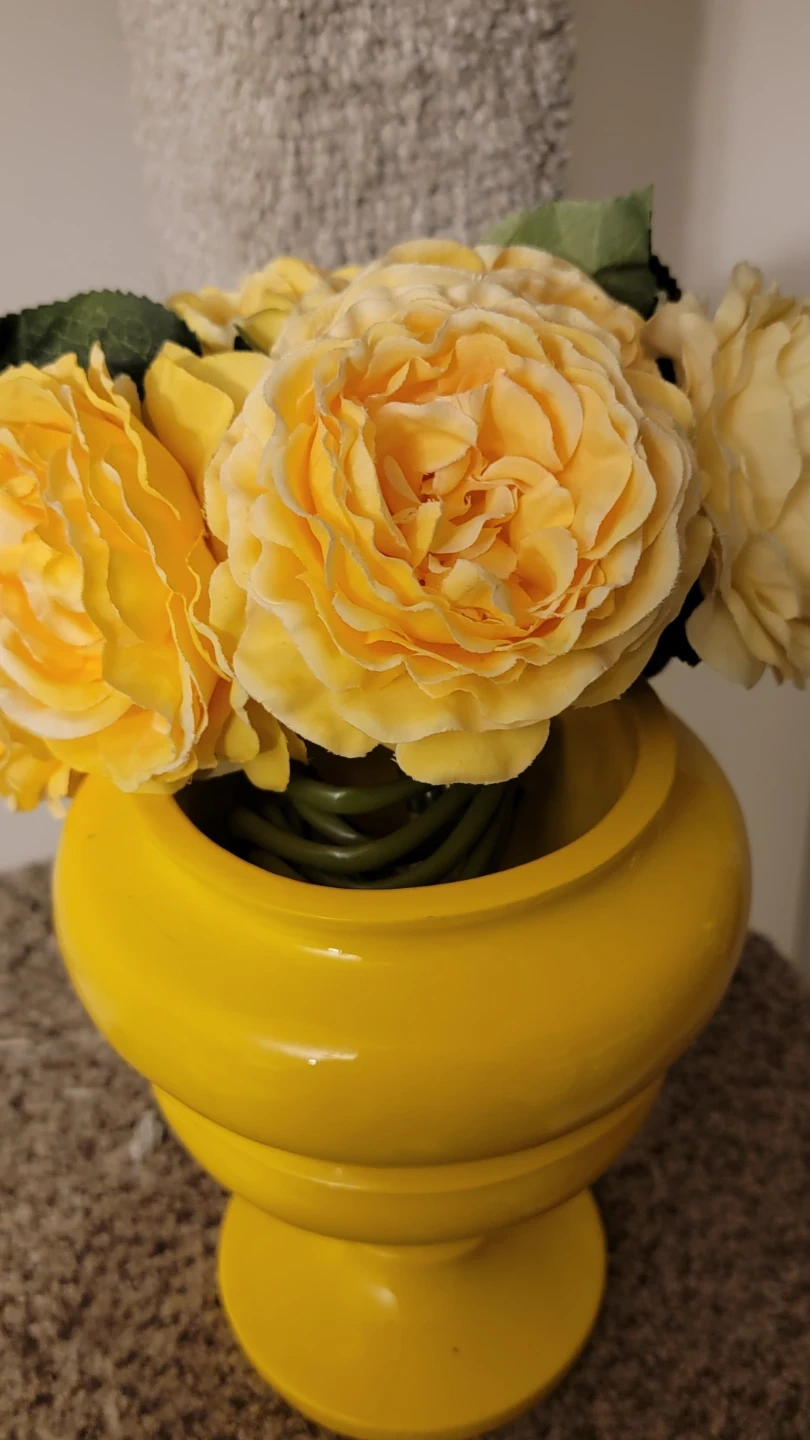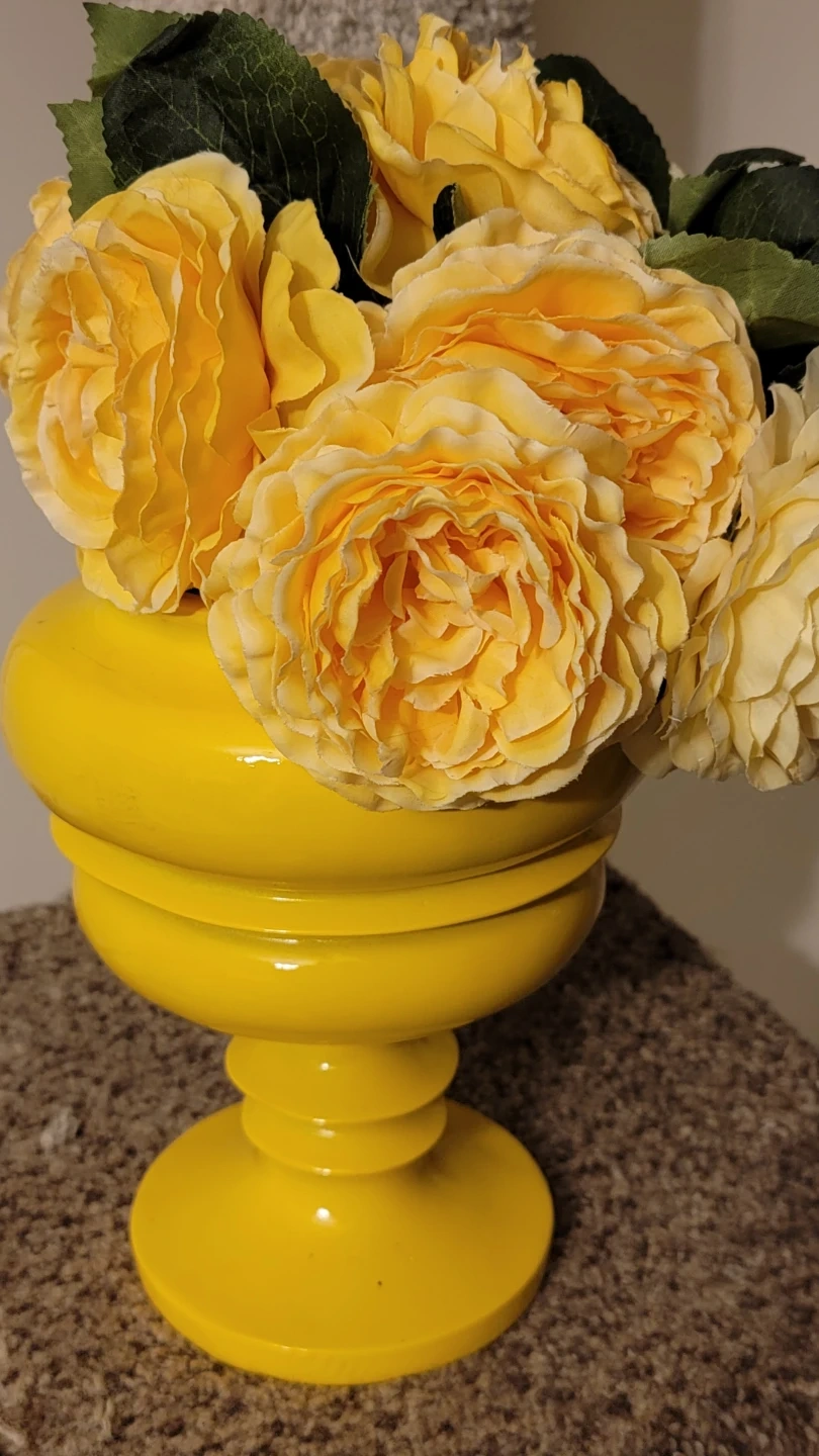 A vibrant yellow decorative vase with a pedestal base. Its cheerful colour makes it a lovely accent piece for any room. This vase has a smooth finish.