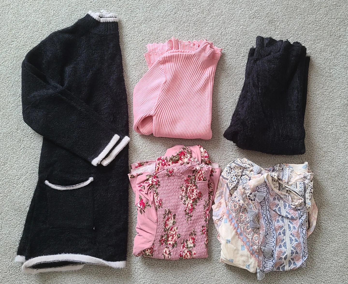 Selling as a pile. All for $30. Includes 10 tops, 5 pants, and 1 jacket. A total of 16 items. A mix of sizes XS/S.