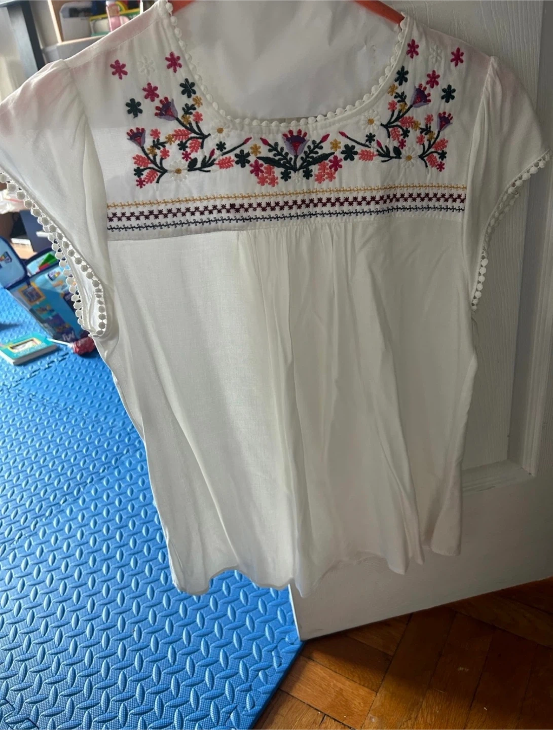 White short-sleeve top with colorful floral embroidery around the neckline and a decorative trim. It has a rounded neckline and playful pom-pom detailing on the sleeves and hem. Lightweight fabric for comfort.