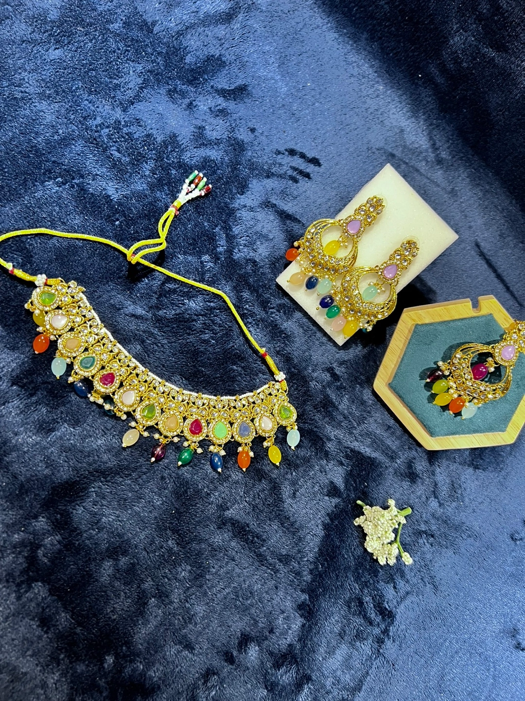 Beautiful jewellery set that includes a necklace and matching earrings! The set features colourful stones and gold detailing, perfect for adding a touch of elegance to any outfit