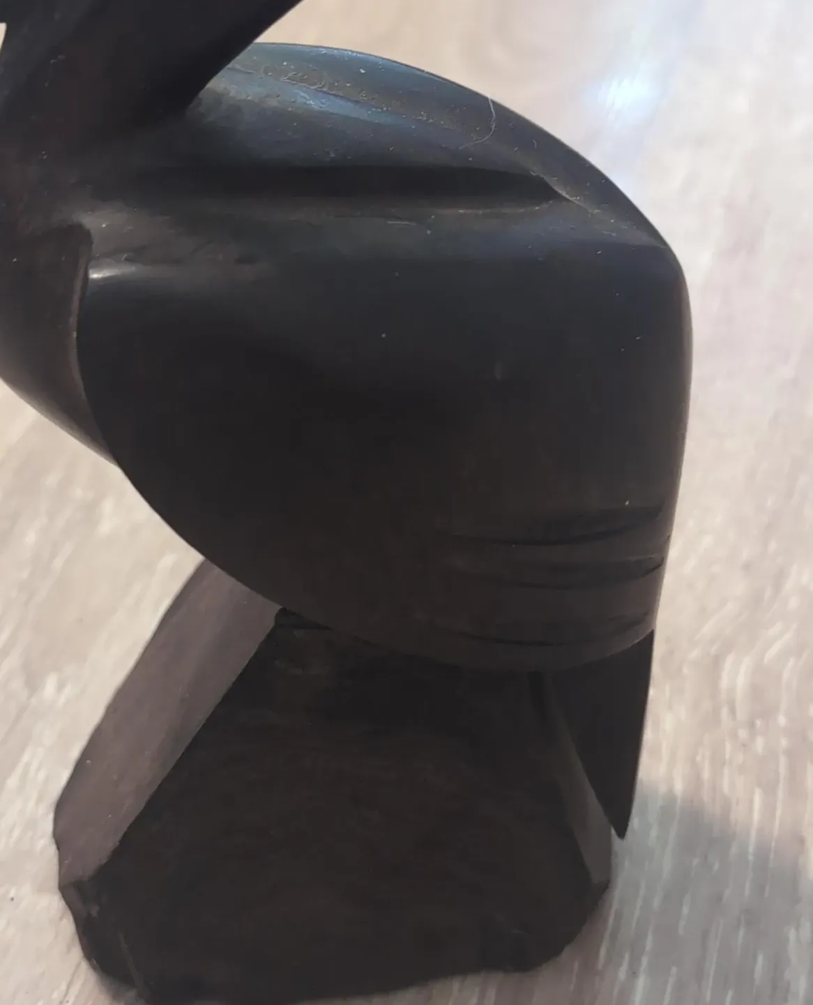 This is a dark wood carving figurine with a modern abstract design. It's carved from solid wood and has a smooth finish. This piece would add a touch of elegance to any shelf or tabletop.