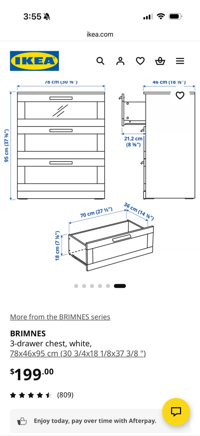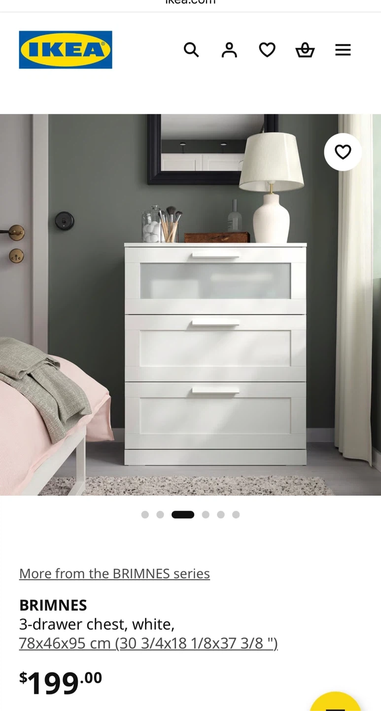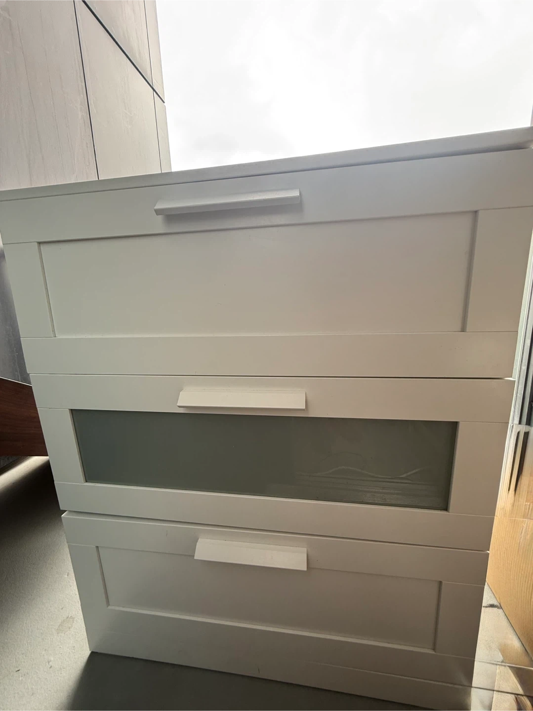 This is an IKEA BRIMNES 3-drawer chest in white. It measures 78x46x95 cm. One drawer has a frosted glass front.