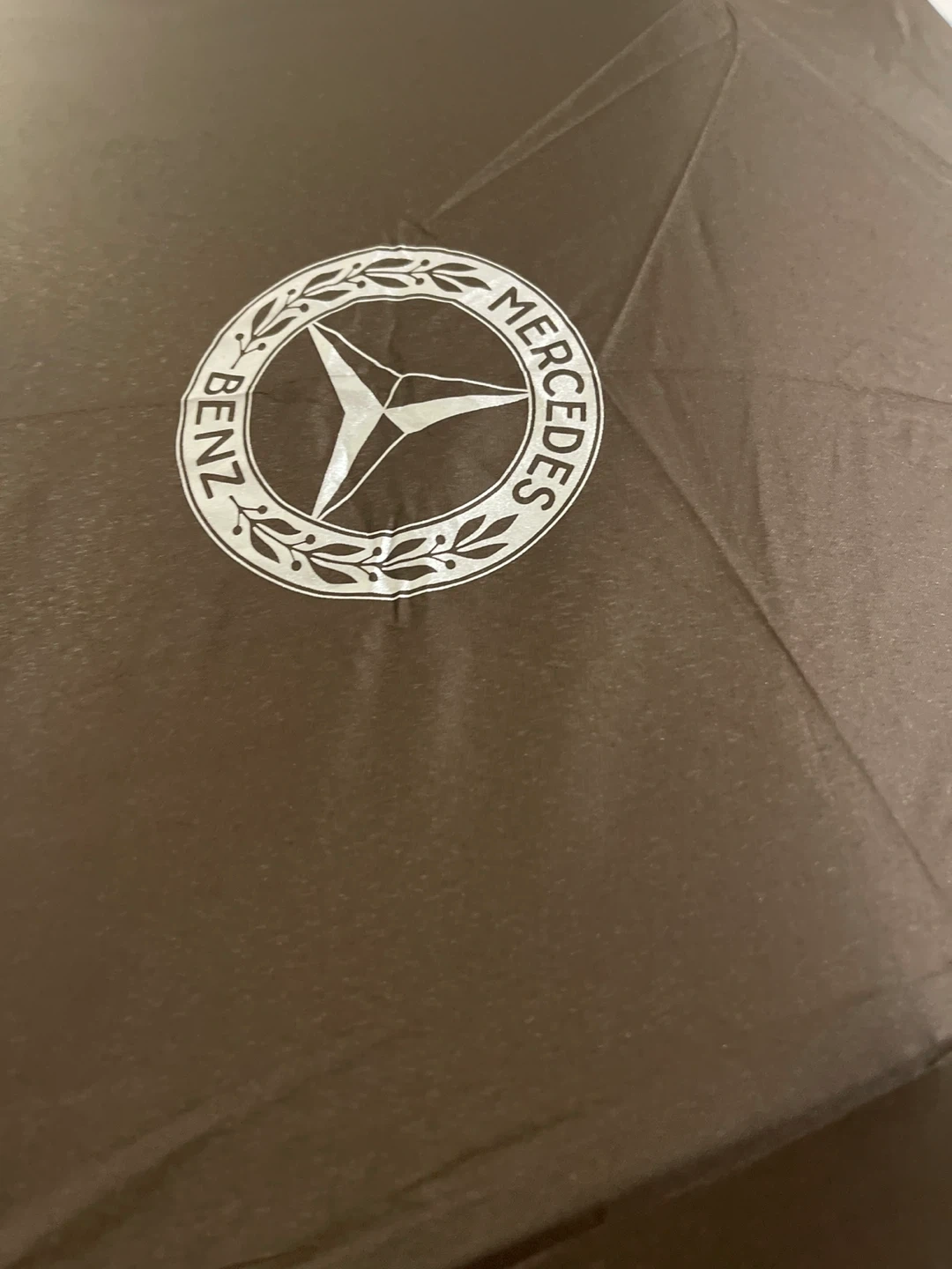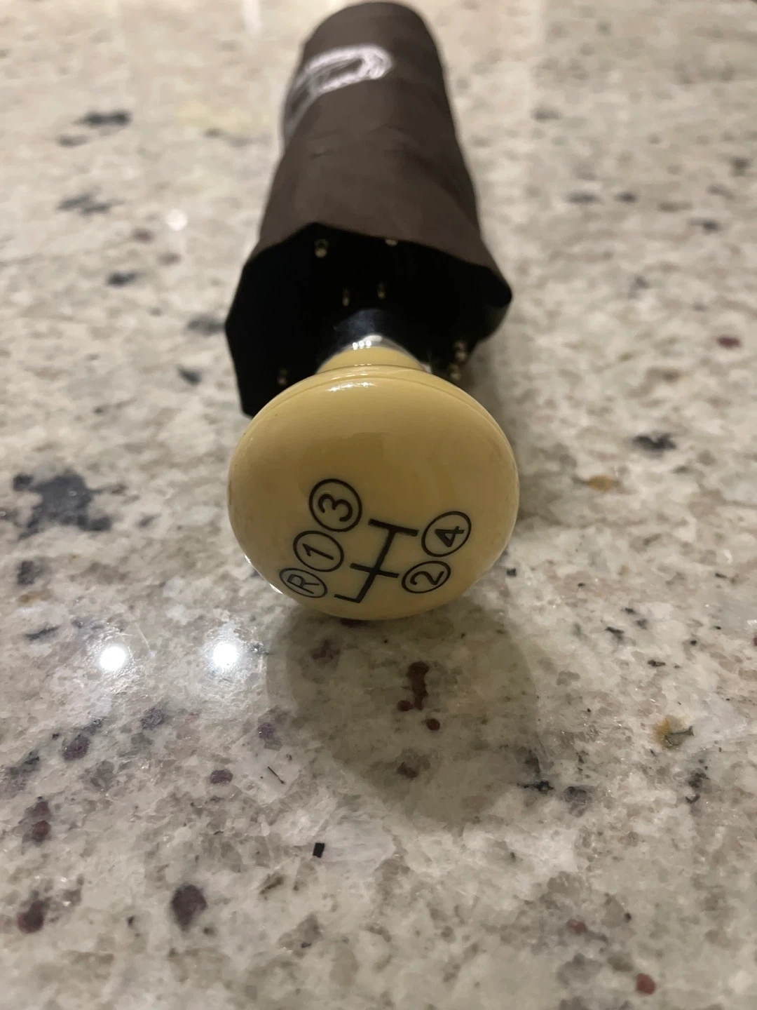 This is a brown Mercedes-Benz umbrella. It has a unique gear shift knob handle. Comes with a matching sleeve for storage.